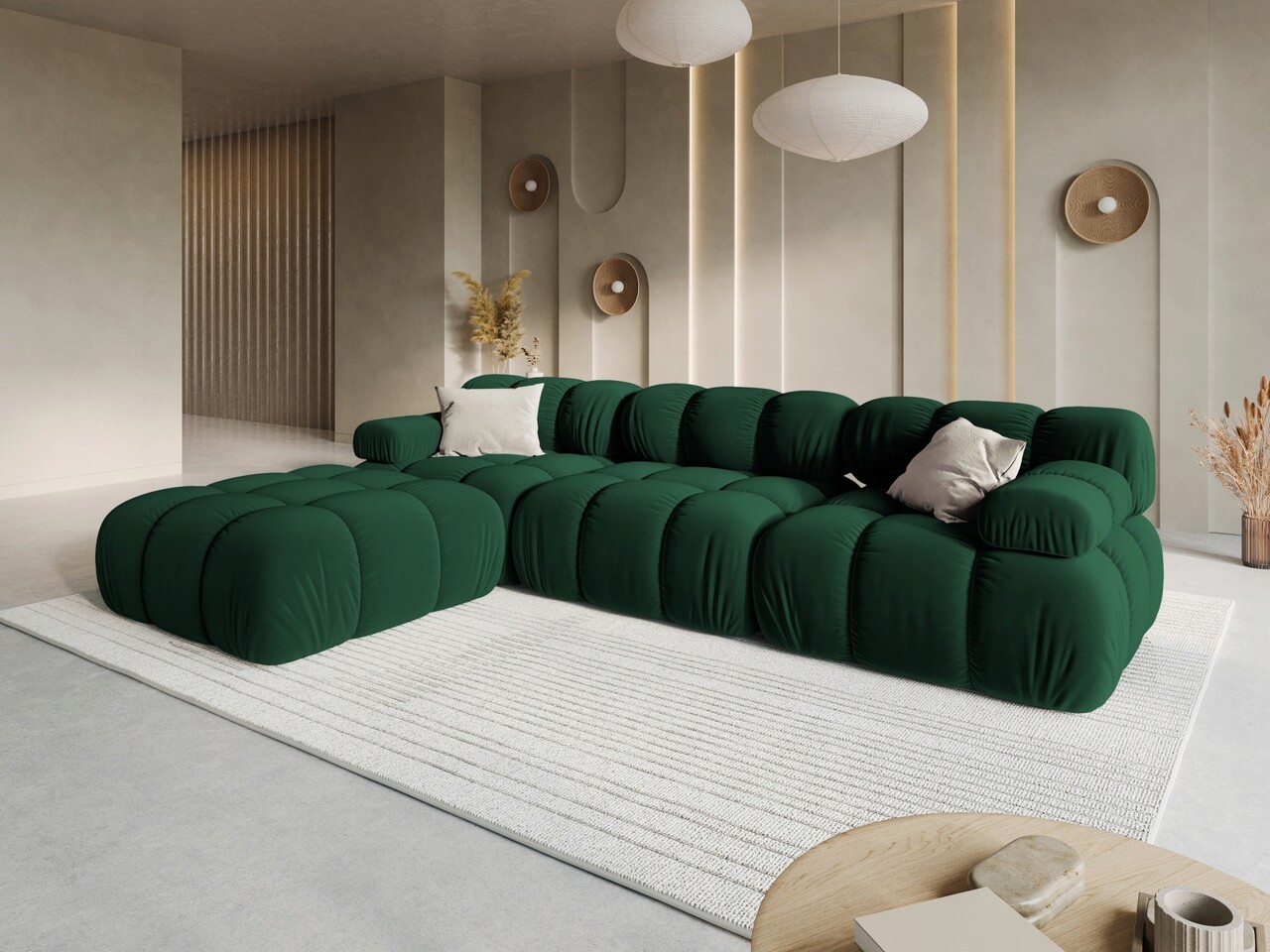 Brandul Micadoni Home este rezultatul multor ani de pasiune in domeniul designului de mobilier. Acesta se adreseaza clientilor care iubesc interioarele confortabile si moderne. Gama larga de culori si designul unic subliniaza caracterul marcii.Atmosferele diferite create de fiecare colectie vor atrage clientii care vor aprecia confortul, formele moderne si calitatea materialelor selectate. Tapiterie din plus de catifea cu aspect luxos si o stralucire delicata. Alegerea perfecta pentru modelele de mobilier elegante. Are o rezistenta foarte buna la abraziune, ceea ce reduce semnificativ riscul de deteriorare a acesteia (100.000 de cicluri de frecare conform testului Martindale). Materialul este extrem de moale, matasos la atingere. Datorita firului mai lung, tesatura se poate schimba in timpul utilizarii. Tesatura poate fi curatata in stare umeda si calcata la temperatura scazuta. De asemenea, este permisa curatarea chimica. Tesatura a trecut testul tigarilor, ceea ce inseamna ca materialul este rezistent la aprindere prin combustie si flacara si respecta standardul PN-EN 1021-1: 2014-12.Dimensiunile prezentate se refera la configurarea canapelei de colt. Nu ezitati sa reconfigurati dispunerea modulelor prezentate in imagine in functie de preferintele dvs. Combinati-le, separati-le si deplasati-le pentru a le armoniza cu estetica spatiului dvs. de locuit. Datorita suprafetei sale caracteristice, tesatura de catifea poate avea un aspect diferit in functie de unghiul de lumina. Acest efect este caracteristic pentru un astfel de material textil. Atunci cand rearanjati elementele modulare ale canapelei, nuanta materialului de catifea poate crea diferente subtile in aspectul modulelor.Compozitie materialMaterial tapiterie: catifeaMaterial structura: cadru din lemn masiv de pin, PAL, placi din fibra, placaj, arcuri, picioare din plastic negru.Compozitie umplutura sezut: spuma poliuretanica 30 kg/mcCompozitie umplutura spatar: spuma poliuretanica 25 kg/mcUmplutura cu arcuri: daModel arcuri: ondulate si zig-zagInformatii si dimensiuni specificeLungime sezut: 158 cmAdancime sezut: 62 cmInaltime sezut: 39 cmInaltime spatar: 27 cmInaltime brate: 54 cmLatime brate: 20 cmGreutate maxima suportata: 450 kgProdusul nu necesita asamblare.Picioare din plastic de culoare neagra.Picioarele sunt asamblate.Inaltime picioare: 2.5 cmNumar picioare: 16Fabricat in Europa