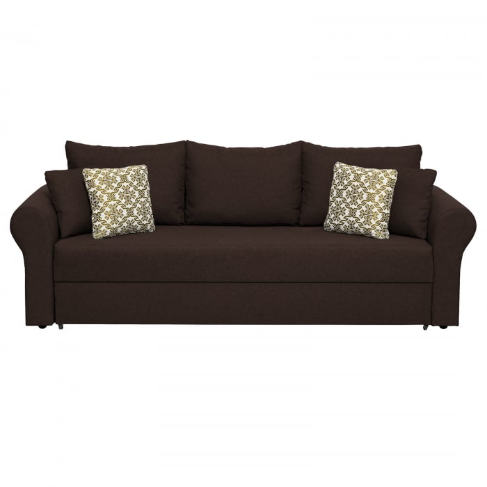 Canapea SARA II extensibila, 3 locuri, cu lada depozitare, maro inchis + print MZT verde, 235x90x75 cm