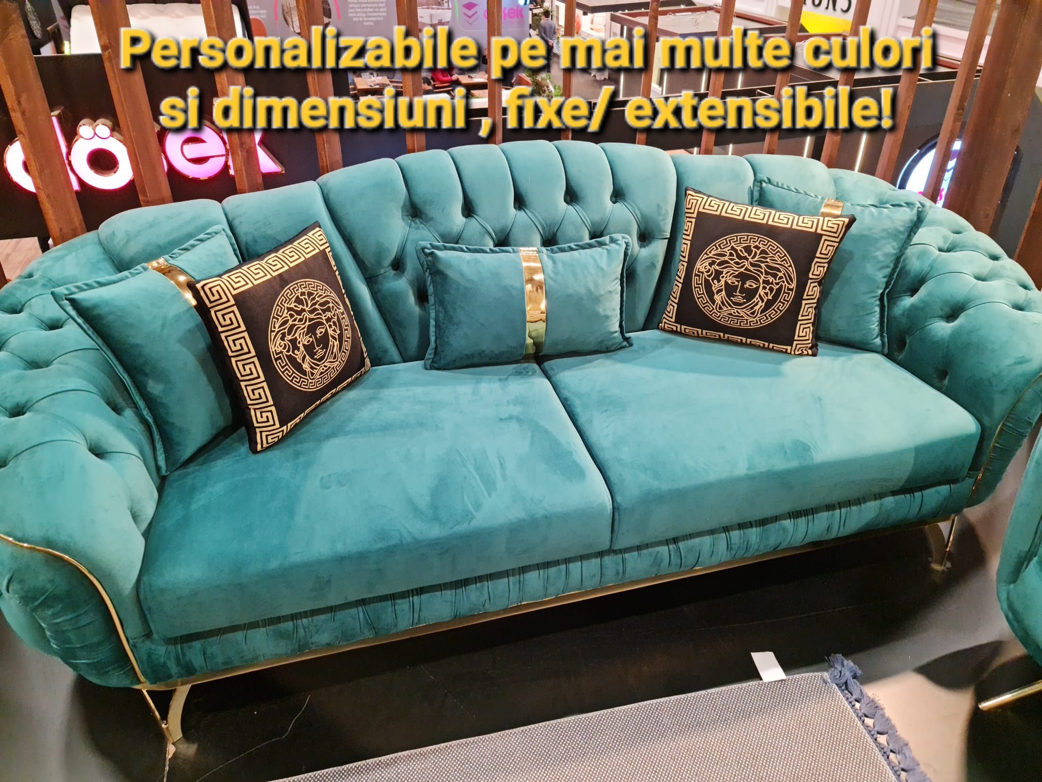 Finisajele șic de culoare aurie într-un stil glamour fac ca piesa de mobilier să se potrivească practic în orice stil. Tapițeria aspectuoasa și moale la atingere fac canapeaua confortabila si garantează condițiile perfecte pentru relaxare. Material: Catifea , Culoare: turcoaz , cu insertii aurii Dimensiuni: 220 cm x 75 cm x 90 cm Acesta se…
