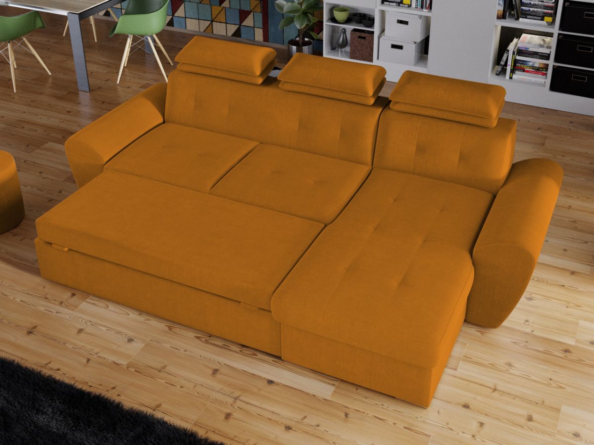Coltar Barini Portocaliu Coltar Barini Portocaliu este un coltar cu design modern, cu forme rotunjite. Tetierele reglabile in mai multe trepte asigura confortul necesar in momentele de relaxare, sustinand capul exact in pozitia dorita. Picioarele argintii si butonii de pe sezut si de pe spatar confera eleganta acestui coltar. Se poate transforma intr-un pat in doar cateva minute si este prevazut cu lada pentru depozitare pozitionata sub sezlong, care poate fi accesata prin ridicarea partii superioare a acestuia. Coltarul are dimensiunea de: 280 cm lungime, 180 cm latime, 105 cm inaltime totala . Dupa extindere, obtineti un spatiu pentru odihna si relaxare, cu suprafata utila 228 x 130 cm . Este tapitat cu stofa de calitate pe diverse culori. Atentie: Pretul afisat nu include alte accesorii sau obiecte de decor. Taburetele, pernele deco si draperiile se pot achizitiona optional. Livrare gratuita si rapida, 4-10 zile lucratoare prin flota proprie Suntem producatori de tapiterii, fara intermediari Toate piesele de tapiterii au o garantie de 2 ani Sezutul si extensia coltarului sunt din poliuretan High Resilience . Scheletul este rezistent, realizat pe structura solida de fag si pal. Extensia de tip sertar este pozitionata sub sezutul coltarului. Se deschide ca un sertar, apoi se ridica salteaua din interiorul acestuia. Coltar Barini Portocaliu se incadreaza cu usurinta in majoritatea locuintelor indiferent de stilul acestora. Puteti alege din mai multe culori pentru stofa. Produsele disponibile le puteti vedea aici Modele Barini . Videoclipul contine alta nuanta decat cea de pe pagina produsului, acesta avand ca scop prezentarea familiei pentru a se reda in detaliu aspectul materialului. Dimensiuni Coltar Barini Lungime: 280 cm Latime: 180 cm Lungime intre brate: 228 cm Inaltime sezut: 45 cm Inaltime : 105 cm Adancime sezut: 65 cm Adancime selon 135 cm Latime sezlon 90 cm Dimensiuni extinsa Lungime extinsa: 228 cm Adancime extinsa: 130 cm Tapiterie Coltar Barini Portocaliu Tapiteria produsului este din stofa Portocalie. Nuanta acestui produs nu este pretentioasa, mascheaza eventualele evenimente neplacute prin care se poate murdari sau pata si se integreaza perfect in majoritatea locuintelor. Intretinere: se recomanda ca praful sa se stearga cu un material textil moale (finet) umed si sa nu se curete cu agenti chimici (diluant, acetona). Imaginile sunt cu titlu de prezentare si pot avea mici diferente de nuante in functie de display. Dimensiunile sunt exprimate în centimetri și pot oscila între ± 50 mm.