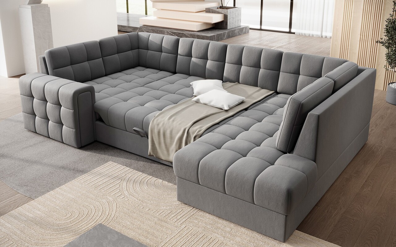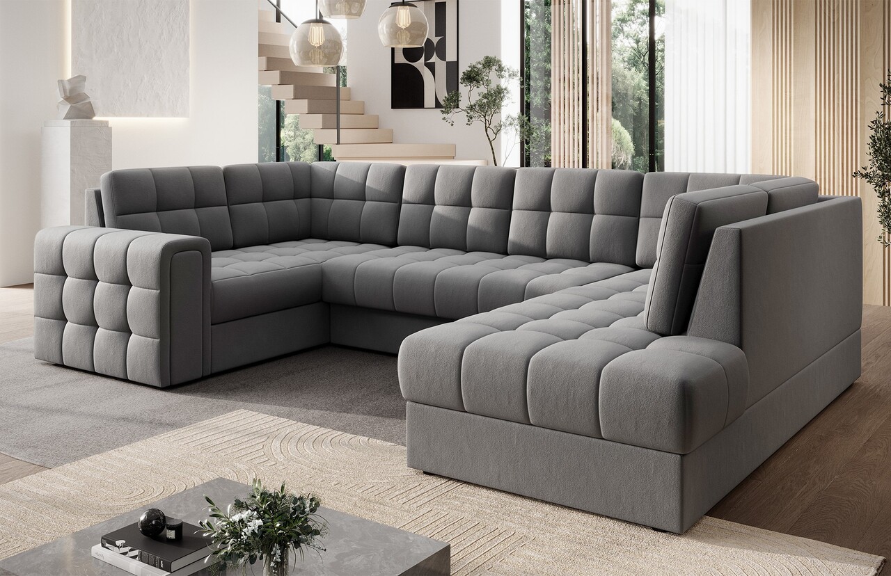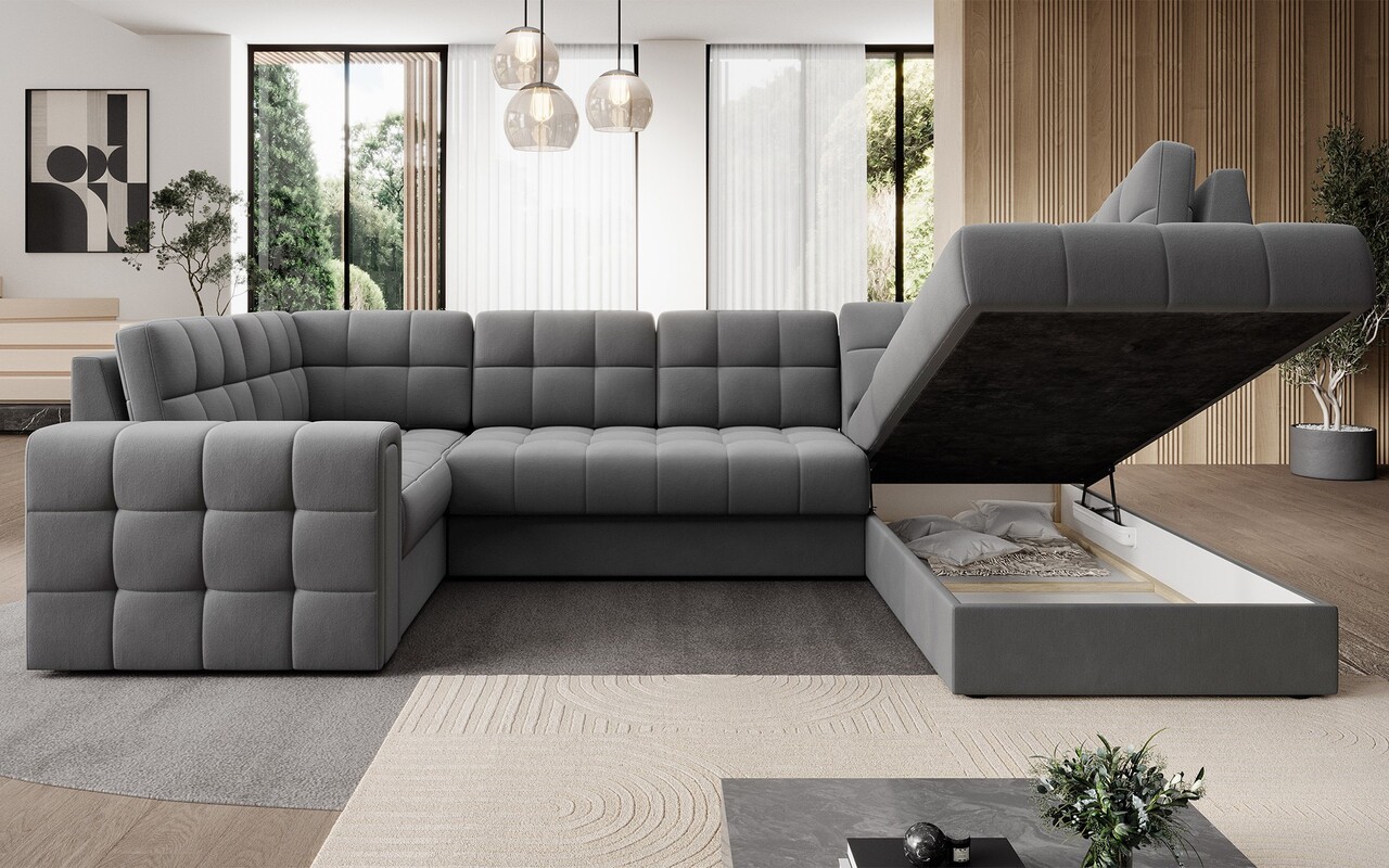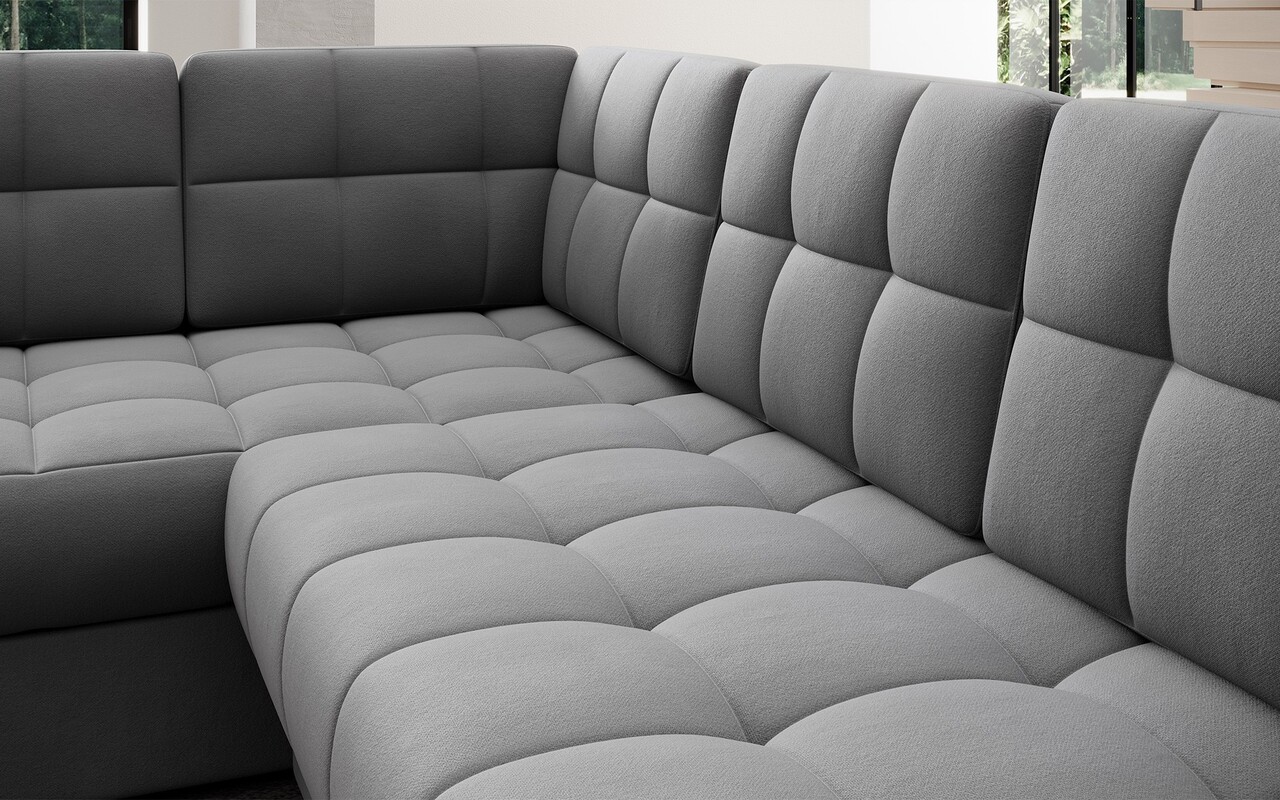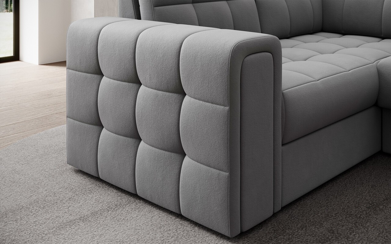 Coltarul modern extensibil Blewett este alegerea ideala pentru cei care cauta un coltar elegant si confortabil pentru living. Modelul Blewett se remarca prin sezutul confortabil realizat cu arcuri ondulate de tip B si spume poliuretanice T2540 si T2130, ce ofera confort si durabilitate in timp. Spatarul este umplut cu spuma moale care se adapteaza perfect formei spatelui, sporind relaxarea. Coltarul Blewett este dotat cu un mecanism de extindere tip delfin care permite o transformare rapida in pat, si cu un spatiu de depozitare practic pentru lenjeria de pat. Spatarul complet tapitat permite amplasarea libera oriunde in camera. Picioarele negre, solide, din plastic accentueaza stilul modern. Calitatea inalta a executiei, functionalitatea si designul modern fac din Blewett un coltar extensibil excelent, ideal chiar si pentru cei mai pretentiosi utilizatori.Compozitie materialMaterial tapiterie: 100% poliester (tesatura primara Sola 04).Material cadru: lemn de pinUmplutura sezut: arc ondulat tip B, spuma poliuretanica T2540, spuma poliuretanica T2130Pentru un spatar mai confortabil au fost adaugate 6 perne.Umplutura perne: granule de spumaPicioare din plastic de culoare neagra.Informatii suplimentareLungime sezut: 245 cmInaltime sezut: 42 cmAdancime sezut: 56 cmInaltime picioare: 2.5 cmMecanism extindere tip delfin.Suprafata de dormit: 124×245 cmDimensiuni lada depozitare: 182x73x18 cmGreutatea maxima suportata: 400 kgProdusul necesita asamblare, asamblat partial.