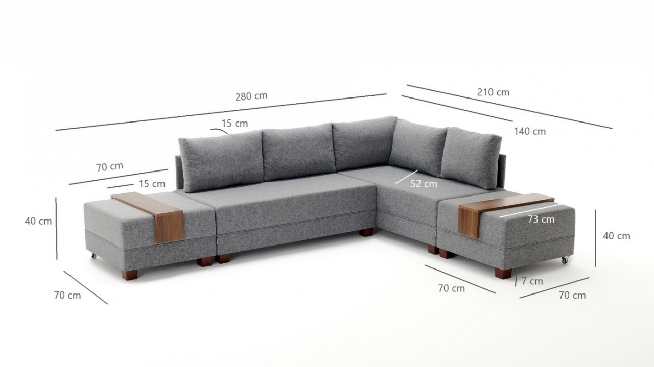 Cadru: Lemn / PAL Laminat Material: 100% Bumbac & Poliester 32 Sezut din Spuma DNS (12 cm) Lemn Picioare Lungime: 210 cm Inaltime: 70 cm Adancime: 280 cm Dimensiune Pat Extins: 140 x 190 Sezut Inaltime: 40 cm Sezut Adancime: 52 cm Sezut Lungime: 210 cm Spate Inaltime: 40 cm Picioare Inaltime: 7 cm