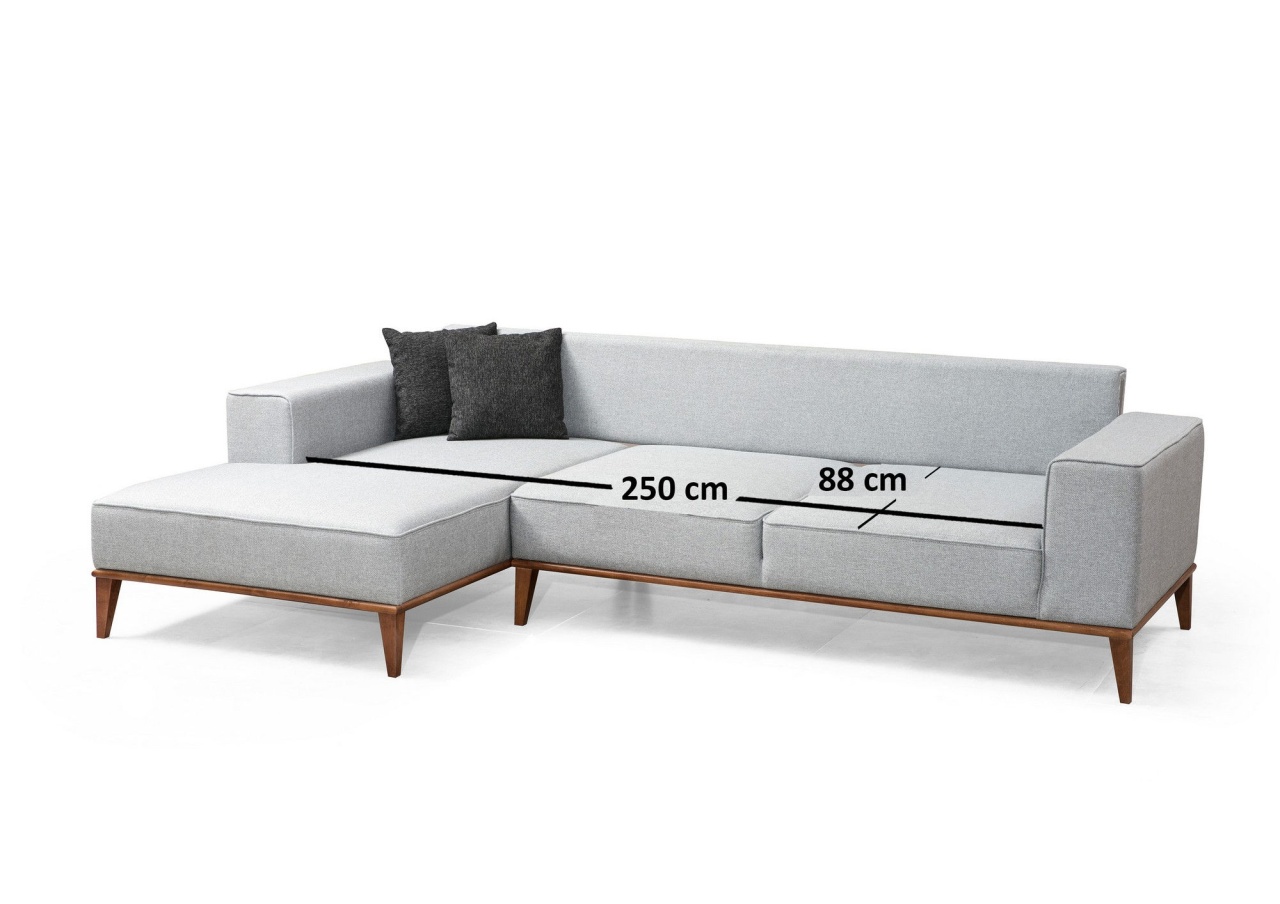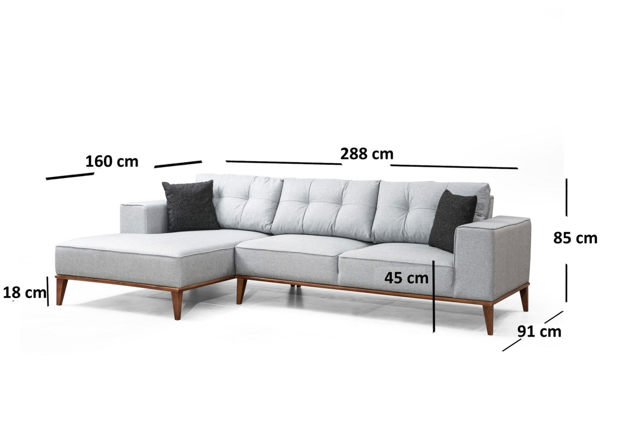 Cadru: Lemn de fag / PAL Tesatura: 100% poliester Lungime: 288 x 160 cm Latime: 91 cm Inaltime: 85 cm Dimensiune pat: Lungime: 250 cm / Latime: 88 cm Spumă: 28 DNS Moale Spumă Gri / 24 DNS Feather/Primăvara în mijloc pentru ședere 60% Spumă tăiată / 40% Spumă siliconică pentru spate Pernă: 60% Spumă tăiată / 40% Spumă siliconică Pernă Dimensiune: 45 x 45 cm Pernă de șezut fixă/pernă de spate portabilă Tesatura de curățat uscat Picioare: picioare din lemn de nuc Spumă Înălțime: 27 cm Număr de pachete: 3 292 x 97 x 70 cm / 43 kg (1 bucată) 166 x 97 x 70 cm / 38 kg (1 bucată) 236 x 12 x 39 cm / 8 kg ( 1 bucata)