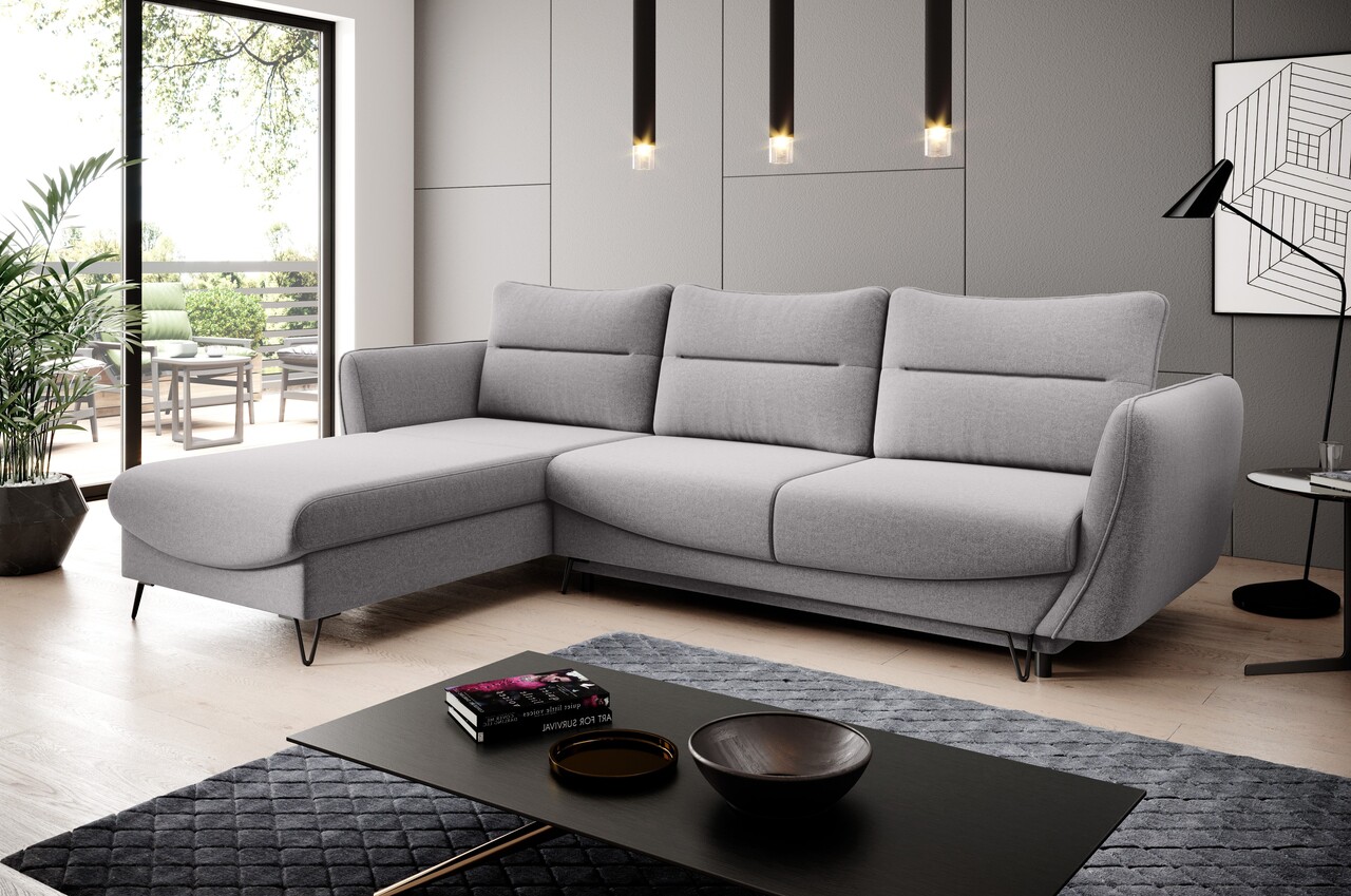 Coltarul Silva are un design atemporal iar picioarele sale negre, distinctive din otel, adauga stil si eleganta moderna. Forma L il face o optiune sociala naturala si, cu siguranta, in livingul in care va fi amplasat va fi suficient spatiu pentru o conversatie confortabila sau petrecerea unei dupa-amiezi placute. Coltarul Silva va avea o durata lunga de viata datorita sezutului umplut cu spuma HR de inalta rezistenta care ofera un suport bun pentru corp si isi recapata rapid forma initiala atunci cand va ridicati. Arcul ondulat folosit la sezutul mobilierului este responsabil pentru a-l face rezistent la colaps. Dimensiunile mobilierului permit plasarea acestuia in mai multe configuratii diferite. Un alt plus este disponibilitatea lui in multe culori si tesaturi. Coltarul extensibil poate fi usor transformat intr-un pat cu dimensiuni generoase. In plus, avantajul coltarului Silva este, de asemenea, un spatiu de depozitare spatios pentru asternuturi. Extinderea de tip DL este, de asemenea, o chestiune extrem de simpla, deoarece este un mecanism usor si intuitiv.Compozitie materialMaterial tapiterie: 100% poliester (tesatura primara Gojo 4).Material cadru: lemn de pinUmplutura sezut: spuma-HRPentru un spatar mai confortabil au fost adaugate 3 perne detasabile.Material perne: poliesterPicioare din otel/plastic de culoare neagra.Informatii suplimentareInaltime sezut: 43 cmAdancime sezut: 57 cmInaltime picioare: 13 cmSuprafata de dormit: 123×240 cmMecanism extindere tip DL (se extrage sezutul si se pliaza spatarul).Greutatea maxima suportata: 315 kgProdusul necesita asamblare, asamblat partial.