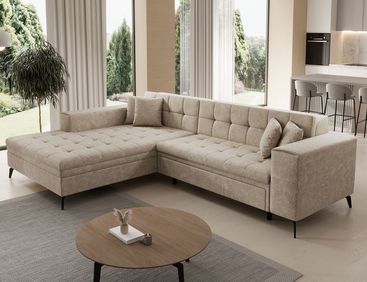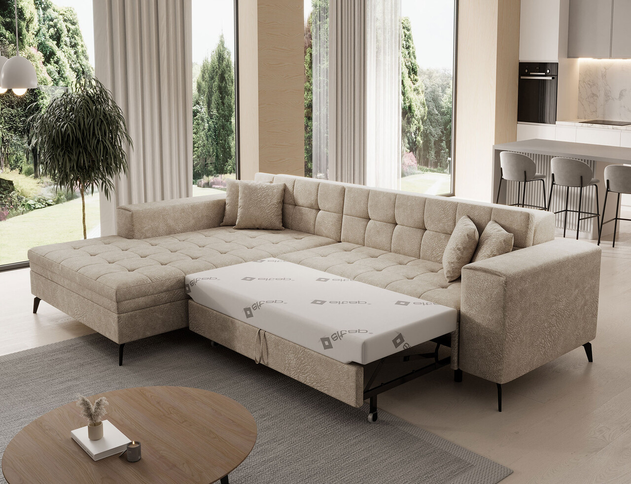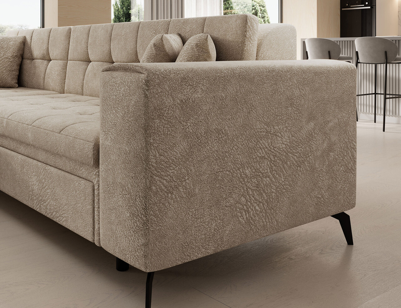 Solange este un coltar original, de bun gust si extrem de moale care aduce un suflu de prospetime si lux interiorului in care este amplasat. Aceasta piesa de mobilier garanteaza confort maxim pentru ca intreaga familie sa se odihneasca, atat ziua cat si noaptea deoarece se poate extinde datorita mecanismului de tip delfin. Sezutul adanc umplut cu arc ondulat si spuma T30, permite nu numai mentinerea pozitiei corecte a corpului, ci si datorita acestora, mobilierul nostru este rezistent la deformare. Coltarul Solange este disponibil intr-o gama larga de culori, ceea ce va ofera numeroase oportunitati de a alege o piesa de mobilier si de a aranja camera de zi in propriul stil individual.Compozitie materialMaterial tapiterie: 100% poliester (tesatura primara Dora 21).Material cadru: lemn de pinPicioare din otel de culoare neagra.Spatarul este fix. Umplutura spatar: spuma-T2130Perne decorative incluse: 4Material perne: poliesterUmplutura perne: granule de spumaUmplutura sezut: spuma-T3030Informatii suplimentareInaltime sezut: 45 cmAdancime sezut: 60 cmInaltime picioare: 13 cmSuprafata de dormit: 123×242 cmMecanism extindere tip delfin.Greutatea maxima suportata: 315 kgProdusul necesita asamblare, asamblat partial.