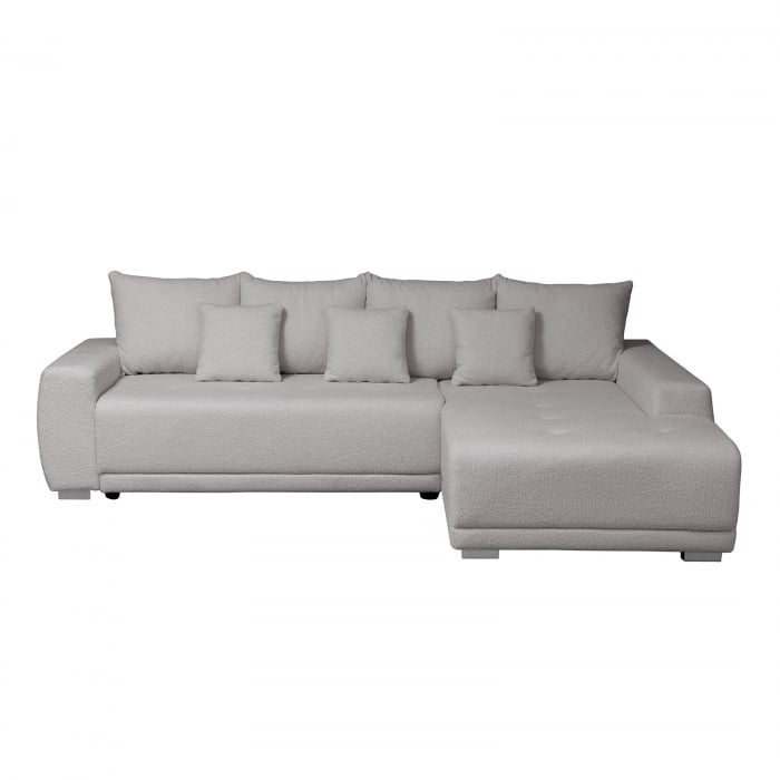 Coltar MARIBO BUCLE extensibil, cu arcuri si lada depozitare, colt dreapta, gri cu nuante roz, 282x205x92 cm