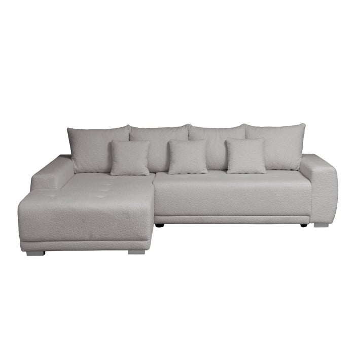 Coltar MARIBO BUCLE extensibil, cu arcuri si lada depozitare, colt stanga, gri cu nuante roz, 282x205x92 cm