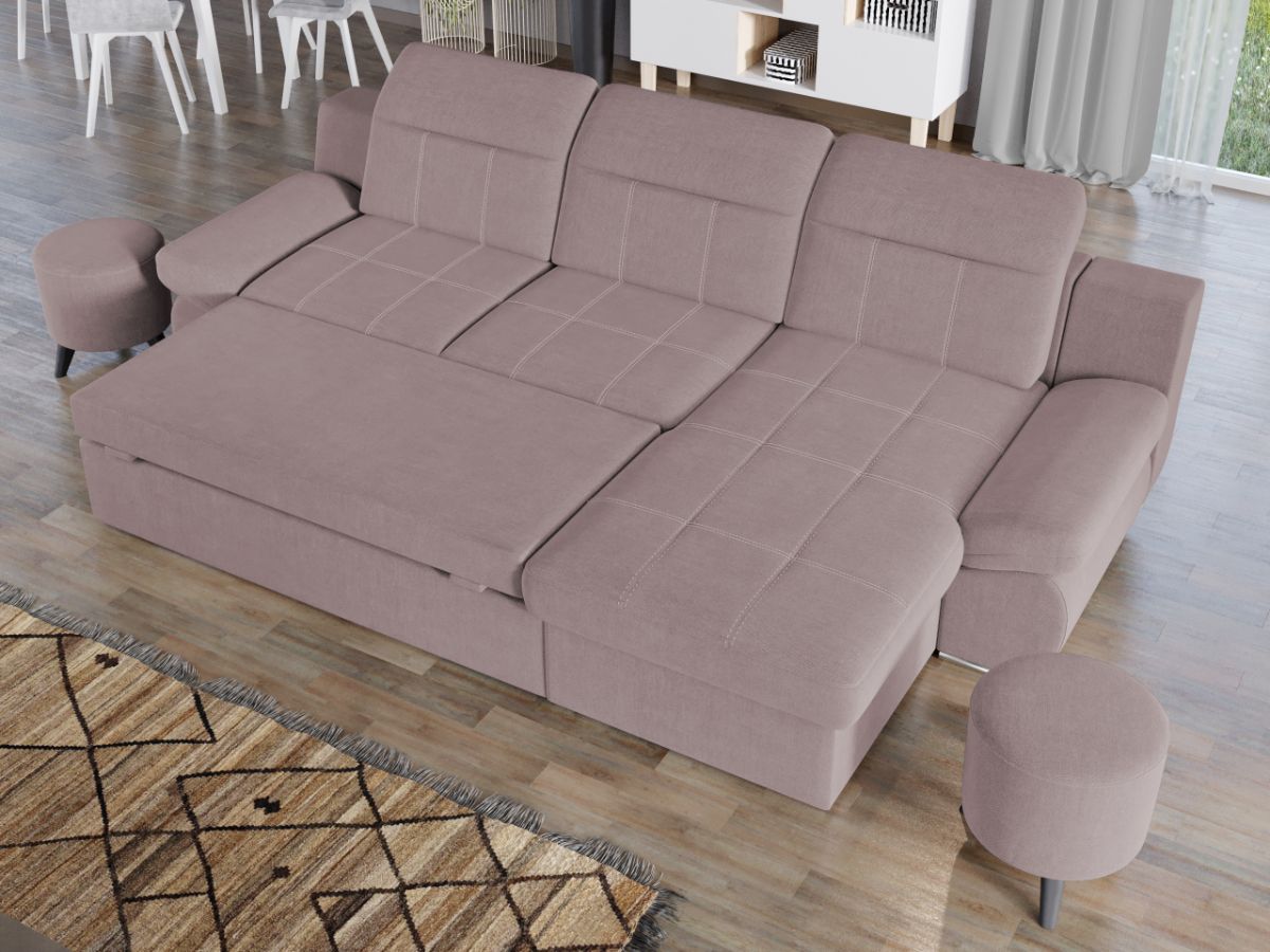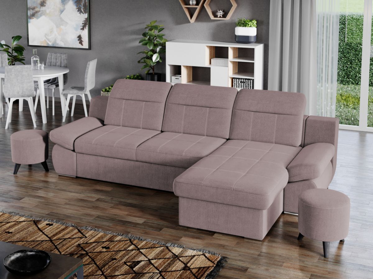 Coltar Mely Roze Avand un design modern si minimalist, Coltar Mely Roze imbina cu succes stilul si confortul, fiind incapator si comod. Spatarul coltarului prezinta trei tetiere reglabile , oferind relaxare completa si un confort sporit pe timp de zi. In plus, acesta este extensibil si se transforma rapid intr-un pat confortabil de 225 x 137 cm . Coltarul este prevazut cu lada pentru depozitare pozitionata sub sezlong, care poate fi accesata usor prin ridicarea partii superioare a acestuia. Picioarele argintii dau un plus de eleganta si stil oricarui living. Este potrivit pentru incaperi mari, avand dimensiunile de: 300 cm lungime, 180 cm latime, 105 cm inaltime totala . Este tapitat cu stofa de calitate pe diverse culori. Atentie: Pretul afisat nu include alte accesorii sau obiecte de decor. Taburetele, pernele deco si draperiile se pot achizitiona optional. Livrare gratuita si rapida, 4-10 zile lucratoare prin flota proprie Suntem producatori de tapiterii, fara intermediari Toate piesele de tapiterii au o garantie de 2 ani Sezutul si extensia coltarului sunt din poliuretan High Resilience . Scheletul este rezistent, realizat pe structura solida de fag si pal. Extensia de tip sertar este pozitionata sub sezutul coltarului. Se deschide ca un sertar, apoi se ridica salteaua din interiorul acestuia. Coltar Mely Roze se incadreaza cu usurinta in majoritatea locuintelor indiferent de stilul acestora. Puteti alege din mai multe culori pentru stofa. Produsele disponibile le puteti vedea aici Modele Mely . Dimensiuni Coltar Mely Lungime: 300 cm Latime: 180 cm Lungime intre brate: 225 cm Inaltime sezut: 44 cm Inaltime: 105 cm Adancime sezut: 64 cm Adancime selon 137 cm Latime sezlon 87 cm Lungime brate: 70 cm Dimensiuni extinsa Lungime extinsa: 225 cm Adancime extinsa: 137 cm Tapiterie Coltar Mely Roze Tapiteria produsului este din stofa Roze. Nuanta acestui produs nu este pretentioasa, mascheaza eventualele evenimente neplacute prin care se poate murdari sau pata si se integreaza perfect in majoritatea locuintelor. Intretinere: se recomanda ca praful sa se stearga cu un material textil moale (finet) umed si sa nu se curete cu agenti chimici (diluant, acetona). Imaginile sunt cu titlu de prezentare si pot avea mici diferente de nuante in functie de display. Dimensiunile sunt exprimate în centimetri și pot oscila între ± 50 mm.