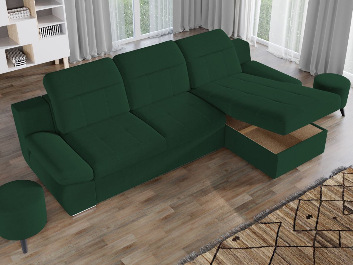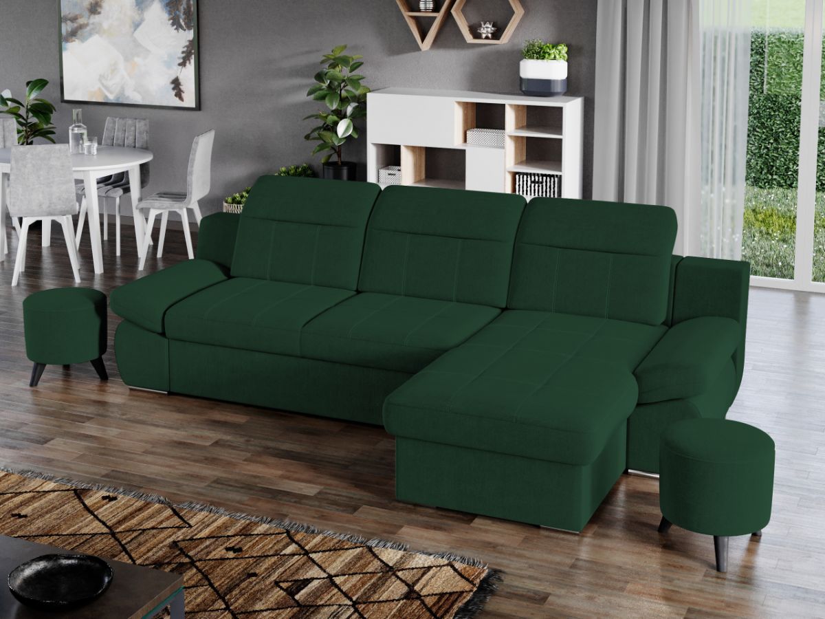 Coltar Mely Verde Avand un design modern si minimalist, Coltar Mely Verde imbina cu succes stilul si confortul, fiind incapator si comod. Spatarul coltarului prezinta trei tetiere reglabile , oferind relaxare completa si un confort sporit pe timp de zi. In plus, acesta este extensibil si se transforma rapid intr-un pat confortabil de 225 x 137 cm . Coltarul este prevazut cu lada pentru depozitare pozitionata sub sezlong, care poate fi accesata usor prin ridicarea partii superioare a acestuia. Picioarele argintii dau un plus de eleganta si stil oricarui living. Este potrivit pentru incaperi mari, avand dimensiunile de: 300 cm lungime, 180 cm latime, 105 cm inaltime totala . Este tapitat cu stofa de calitate pe diverse culori. Atentie: Pretul afisat nu include alte accesorii sau obiecte de decor. Taburetele, pernele deco si draperiile se pot achizitiona optional. Livrare gratuita si rapida, 4-10 zile lucratoare prin flota proprie Suntem producatori de tapiterii, fara intermediari Toate piesele de tapiterii au o garantie de 2 ani Sezutul si extensia coltarului sunt din poliuretan High Resilience . Scheletul este rezistent, realizat pe structura solida de fag si pal. Extensia de tip sertar este pozitionata sub sezutul coltarului. Se deschide ca un sertar, apoi se ridica salteaua din interiorul acestuia. Coltar Mely Verde se incadreaza cu usurinta in majoritatea locuintelor indiferent de stilul acestora. Puteti alege din mai multe culori pentru stofa. Produsele disponibile le puteti vedea aici Modele Mely . Dimensiuni Coltar Mely Lungime: 300 cm Latime: 180 cm Lungime intre brate: 225 cm Inaltime sezut: 44 cm Inaltime: 105 cm Adancime sezut: 64 cm Adancime selon 137 cm Latime sezlon 87 cm Lungime brate: 70 cm Dimensiuni extinsa Lungime extinsa: 225 cm Adancime extinsa: 137 cm Tapiterie Coltar Mely Verde Tapiteria produsului este din stofa Verde. Nuanta acestui produs nu este pretentioasa, mascheaza eventualele evenimente neplacute prin care se poate murdari sau pata si se integreaza perfect in majoritatea locuintelor. Intretinere: se recomanda ca praful sa se stearga cu un material textil moale (finet) umed si sa nu se curete cu agenti chimici (diluant, acetona). Imaginile sunt cu titlu de prezentare si pot avea mici diferente de nuante in functie de display. Dimensiunile sunt exprimate în centimetri și pot oscila între ± 50 mm.