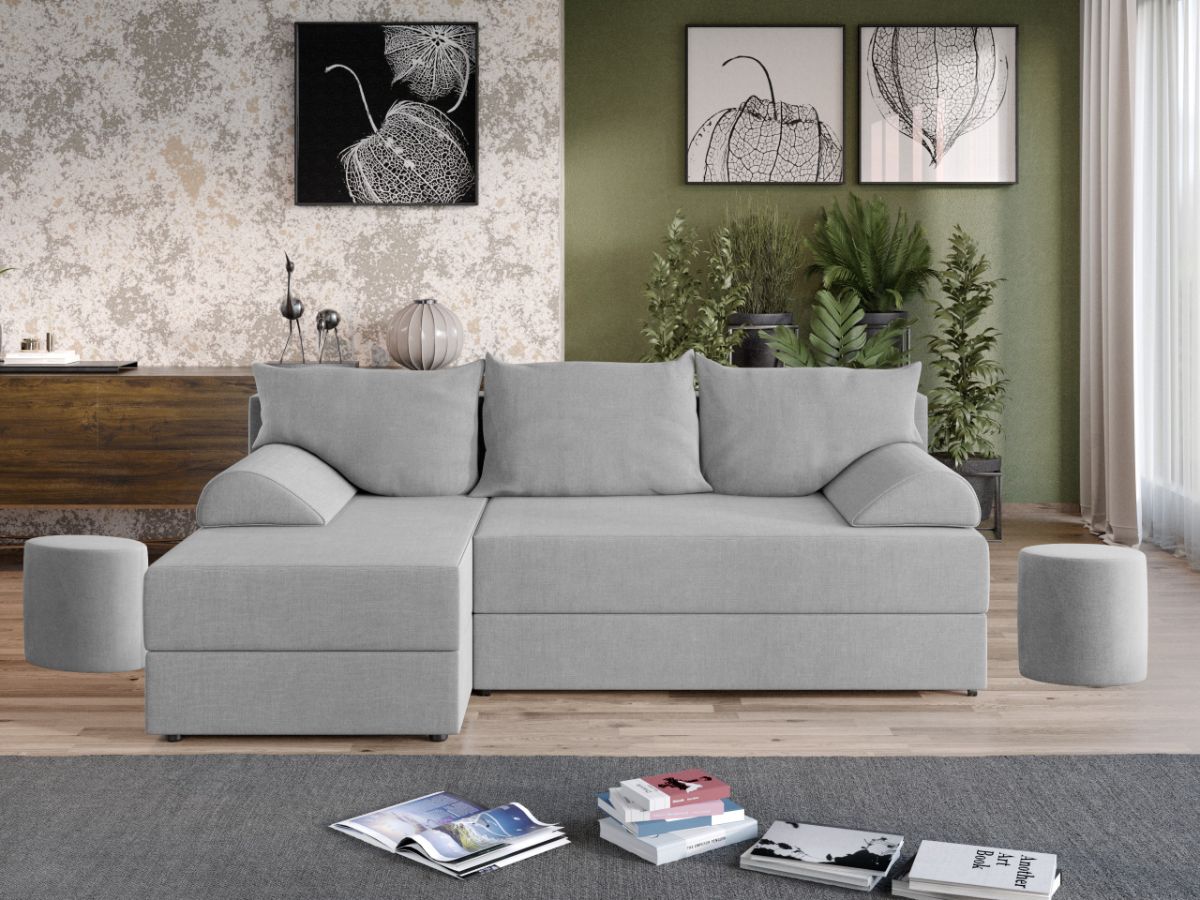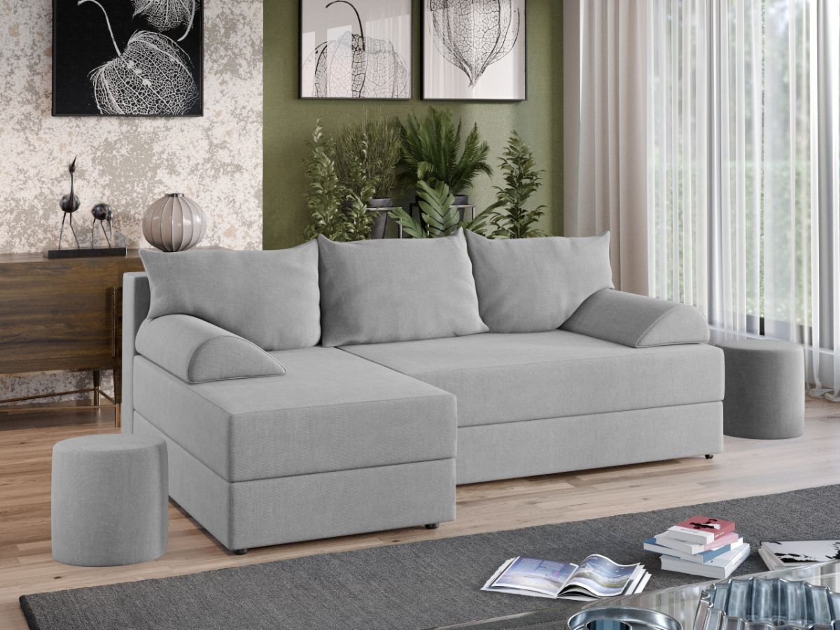 Coltar Mia Gri Deschis Chic, cu un design minimalist, Coltar Mia Gri Deschis creeaza un ambient cald, primitor si este ideal pentru un hol sau living de dimensiuni medii sau mari. Coltarul se transforma rapid si usor intr-un pat spatios de 210 x 135 cm prin tragerea sezutului si rabatarea spatarului. Lada integrata este ideala pentru depozitarea lenjeriei, a pernelor sau a paturii si pentru a pastra la indemana toate articolele frecvent utilizate. Cele 3 perne si bratele detasabile ofera un confort sporit in orice moment. Acesta are dimensiunea de: 210 cm lungime, 135 cm latime, 70 cm inaltime totala . Este tapitat cu stofa de calitate pe diverse culori. Atentie:  Pretul afisat nu include alte accesorii sau obiecte de decor (pernele deco, tablouri, elemente de iluminat, covor etc.). Taburetele, pernele deco si draperiile se pot achizitiona optional. Livrare gratuita si rapida, 4-10 zile lucratoare prin flota proprie Suntem producatori de tapiterii, fara intermediari Toate piesele de tapiterii au o garantie de 2 ani Sezutul si extensia coltarului sunt pe relaxa (arcuri elicoidale și poliuretan) . Scheletul este rezistent, realizat pe structura solida de fag si pal. Extensia este de tip Doppelliege, ce prezinta un sistem actionat prin role, astfel ca partea de sezut se trage si permite partii de spatar sa gliseze spre partea din fata si sa se pozitioneze orizontal. Coltar Mia Gri Deschis se incadreaza cu usurinta in majoritatea locuintelor indiferent de stilul acestora. Puteti alege din mai multe culori pentru stofa. Produsele disponibile le puteti vedea aici Modele Mia . Dimensiuni Coltar Mia Gri Deschis Lungime: 210 cm Latime: 135 cm Inaltime sezut: 40 cm Inaltime : 70 cm Adancime sezut: 80 cm Adancime sezlon 120 cm Dimensiuni extins Lungime extins: 210 cm Adancime extins: 135 cm Dimensiuni brate Inaltime brate: 15 cm Latime brate: 35 cm Lungime brate: 75 cm Tapiterie Coltar Mia Gri Deschis Tapiteria produsului este din stofa Gri Deschis . Nuanta acestui produs nu este pretentioasa, mascheaza eventualele evenimente neplacute prin care se poate murdari sau pata si se integreaza perfect in majoritatea locuintelor. Intretinere: se recomanda ca praful sa se stearga cu un material textil moale (finet) umed si sa nu se curete cu agenti chimici (diluant, acetona). Imaginile sunt cu titlu de prezentare si pot avea mici diferente de nuante in functie de display. Dimensiunile sunt exprimate în centimetri și pot oscila între ± 50 mm.