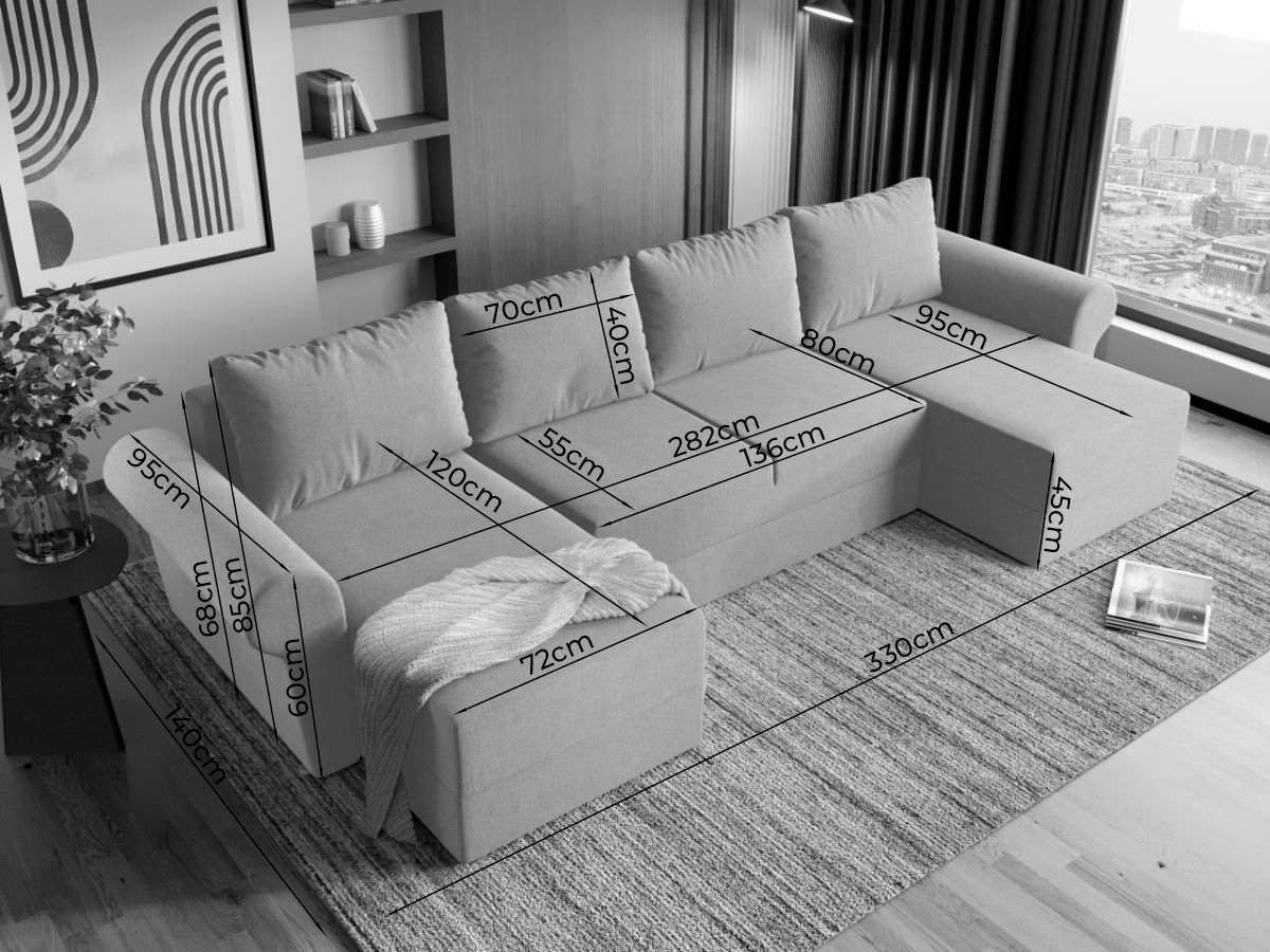 Oferta Coltar U Extensibil Bonito maro Descopera Coltar U extensibil Bonito maro cu design modern si un confort sporit datorat celor doua sezlonguri. Datorita modelului in forma de U , lateralele coltarului alcatuiesc doua sezlonguri spatioase . Este functional si practic, avand spatiu de depozitare, ideal pentru lenjerii si alte obiecte ce nu vrei sa stea la vedere. Coltarul are functie de dormit, astfel se poate transforma intr-un spatiu de dormit pentru tine sau oaspetii tai de 282×140 cm . Pernele detasabile iti asigura sustinere optima si relaxarea pe care o cauti dupa o zi lunga. Livrare gratuita si rapida, 4-10 zile lucratoare cu flota proprie Suntem producatori de tapiterii, fara intermediari Toate piesele de tapiterii au o garantie de 2 ani Sezutul si extensia sunt pe relaxa (arcuri elicoidale si poliuretan) . Extensia este de tip Doppelliege ce prezinta un sistem actionat prin role, astfel ca partea de sezut se trage si permite partii de spatar sa gliseze spre partea din fata si sa se pozitioneze orizontal. Coltar U Extensibil Bonito maro se incadreaza cu usurinta in majoritatea locuintelor indiferent de stilul acestora. Puteti alege din mai multe culori pentru stofa. Produsele disponibile le puteti vedea aici Modele Coltare U Bonito . Videoclipul contine alta nuanta decat cea de pe pagina produsului, acesta avand ca scop prezentarea familiei pentru a se reda in detaliu aspectul materialului. Dimensiuni Coltar U Extensibil Bonito maro Lungime: 330 cm Latime: 140 cm Lungime intre brate: 282 cm Lungime extins: 282 cm Adancime sezut fara perne: 80 cm Adancime sezut cu perne: 55 cm Adancime extins: 140 cm pe partea de canapea Inaltime cu perne: 85 cm Inaltime fara perne: 68 cm Inaltime sezut: 45 cm Tapiterie Coltar U Extensibil Bonito maro Tapiteria produsului este din stofa Maro . Nuanta acestui produs nu este pretentioasa, mascheaza eventualele evenimente neplacute prin care se poate murdari sau pata si se integreaza perfect in majoritatea locuintelor. Atentie: Pretul afisat nu include alte accesorii sau obiecte de decor. Taburetele, pernele deco si draperiile se pot achizitiona optional. Intretinere: se recomanda ca praful sa se stearga cu un material textil moale (finet) umed si sa nu se curete cu agenti chimici (diluant, acetona). Imaginile sunt cu titlu de prezentare si pot avea mici diferente de nuante in functie de display. Dimensiunile sunt exprimate în centimetri și pot oscila între ± 50 mm. DESCARCA SCHITA DE MONTAJ