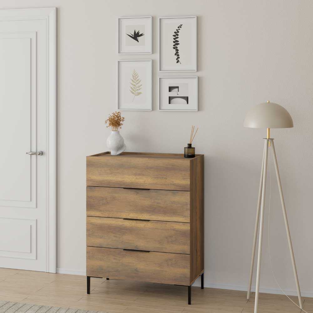Adaugă un element de eleganță și funcționalitate în locuința ta cu această comodă rafinată. Cu designul său simplu și finisajele impecabile, această comodă este soluția ideală pentru a păstra ordine în spațiul tău de locuit. Cu o construcție solidă, comoda oferă loc suficient pentru depozitarea obiectelor personale și a altor lucruri importante. Versatilă și practică, această comodă se potrivește perfect în orice încăpere, de la dormitor până la living. Alege calitatea și stilul pentru locuința ta cu această comodă de încredere! Dimensiuni: 80 x 104 x 44 cm Culoare: Alb – Nuc Specificatii: Textura de lemn natural imbinat cu lemn vopsit multicolor Manere din metal placate cu crom 4 sertare foarte spatiose Design ergonomic, adecvat pentru utilizarea in spatii mici Picior special creat pentru a evita zgarierea pardoselii