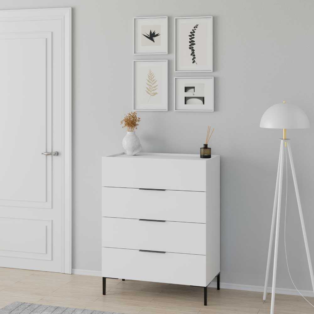 Adaugă un element de eleganță și funcționalitate în locuința ta cu această comodă rafinată. Cu designul său simplu și finisajele impecabile, această comodă este soluția ideală pentru a păstra ordine în spațiul tău de locuit. Cu o construcție solidă, comoda oferă loc suficient pentru depozitarea obiectelor personale și a altor lucruri importante. Versatilă și practică, această comodă se potrivește perfect în orice încăpere, de la dormitor până la living. Alege calitatea și stilul pentru locuința ta cu această comodă de încredere! Dimensiuni: 80 x 104 x 44 cm Culoare: Alb – Nuc Specificatii: Textura de lemn natural imbinat cu lemn vopsit multicolor Manere din metal placate cu crom 4 sertare foarte spatiose Design ergonomic, adecvat pentru utilizarea in spatii mici Picior special creat pentru a evita zgarierea pardoselii