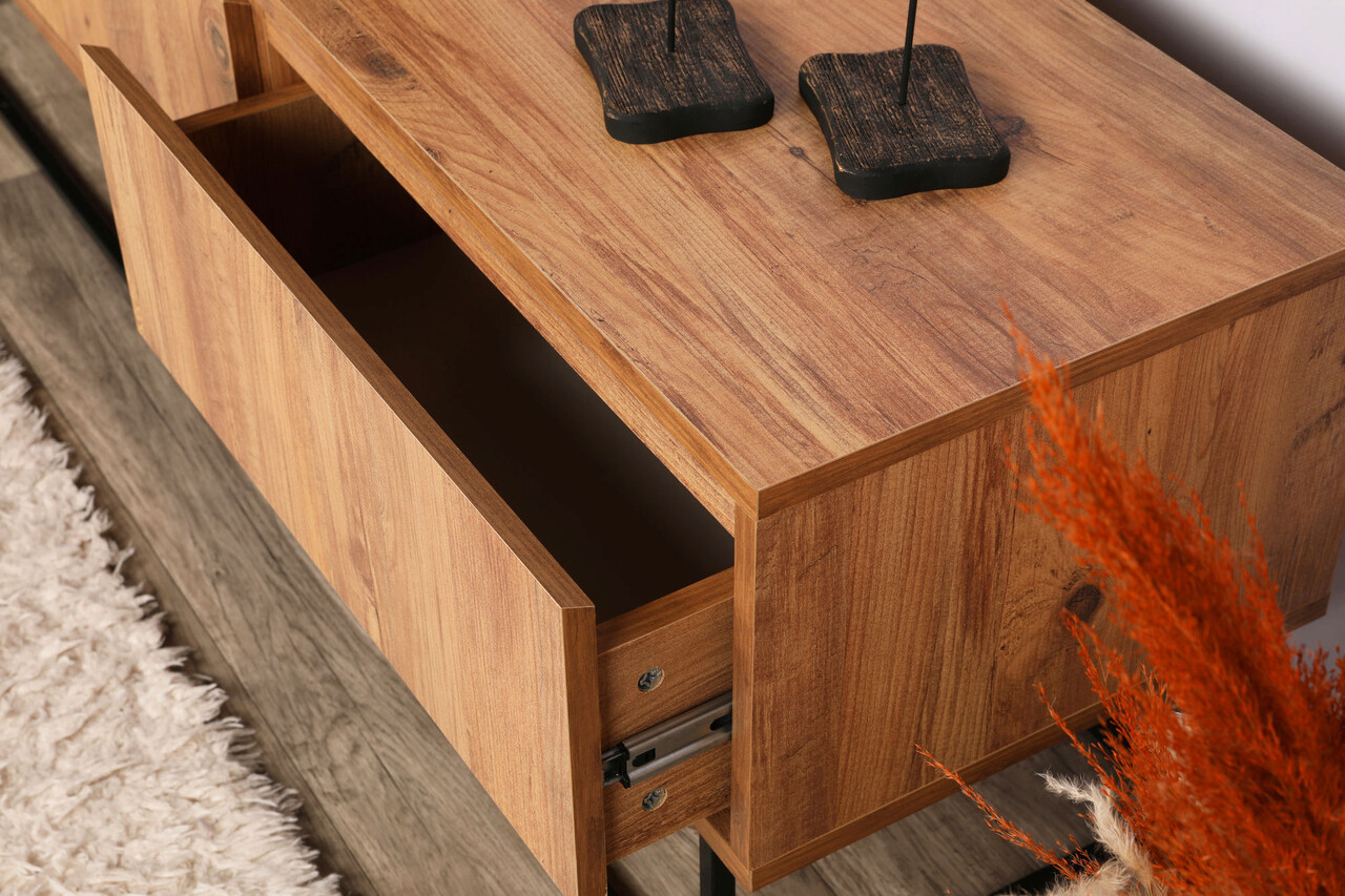Grosime: 18 mmPicioare metaliceLatime: 140 cm Inaltime: 50 cm Adancime: 40 cmDimensiune sertar: Latime: 44,6 cm Inaltime: 22 cm Adancime: 40 cm3 sertareInaltime picior: 22 cmRafturi numeroasePoate fi fixat pe perete