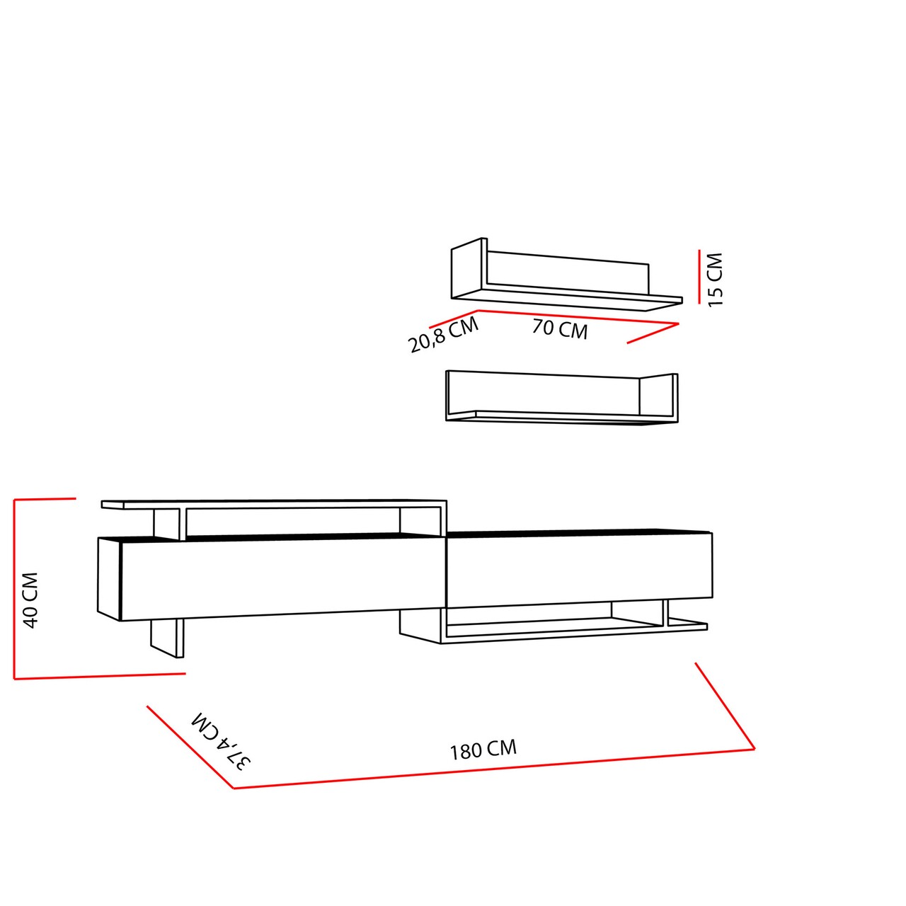 Setul este format din:Comoda TV: 180 x 40 x 37.4 cm (Lxhxl);2 rafturi cu montare pe perete: 70 x 15 x 20.8 cm (Lxhxl).Compozitie material: pal melaminat.Grosime: 1.8 cm.