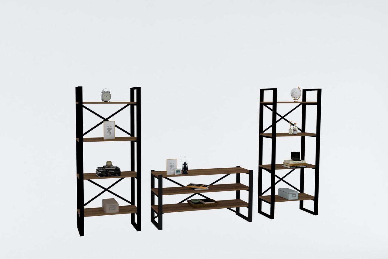 Setul este format din:Comoda TV: 120 x 58.5 x 32 cm (Lxhxl);2 rafturi pentru carti: 66 x 150 x 32 cm (Lxhxl).Compozitie material: pal melaminat, structura metal.Grosime: 1.8 cm.