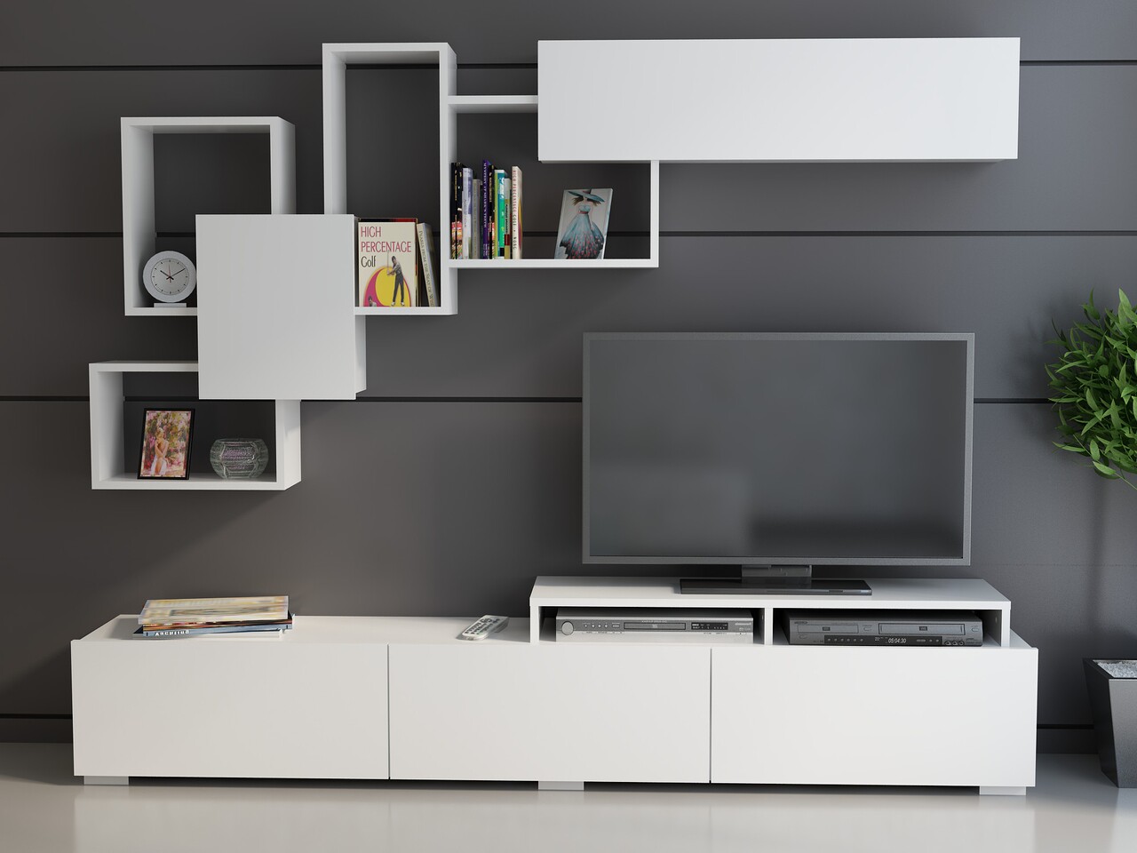 Setul este format din:Comoda TV:210 x 30 x 35 cm (Lxhxl);Raft pentru perete: 25 x 105 cm (Lxh).Compozitie material: pal melaminat.Grosime: 1.8 cm