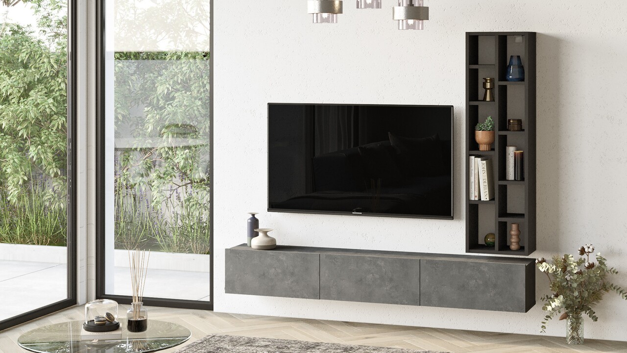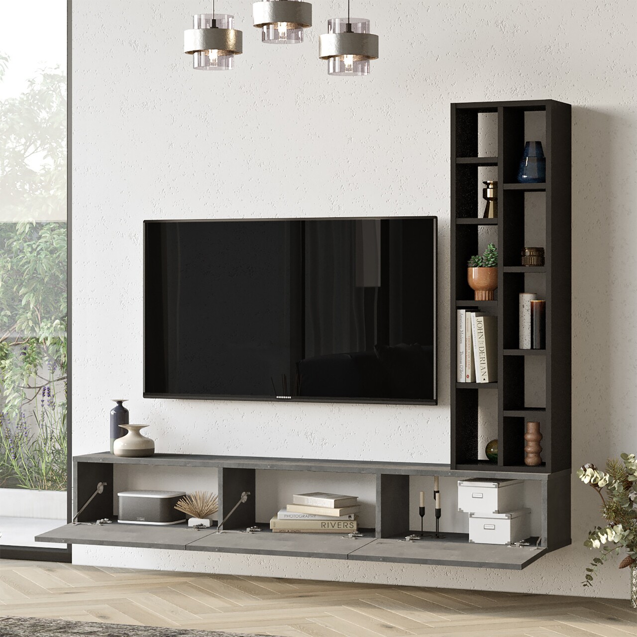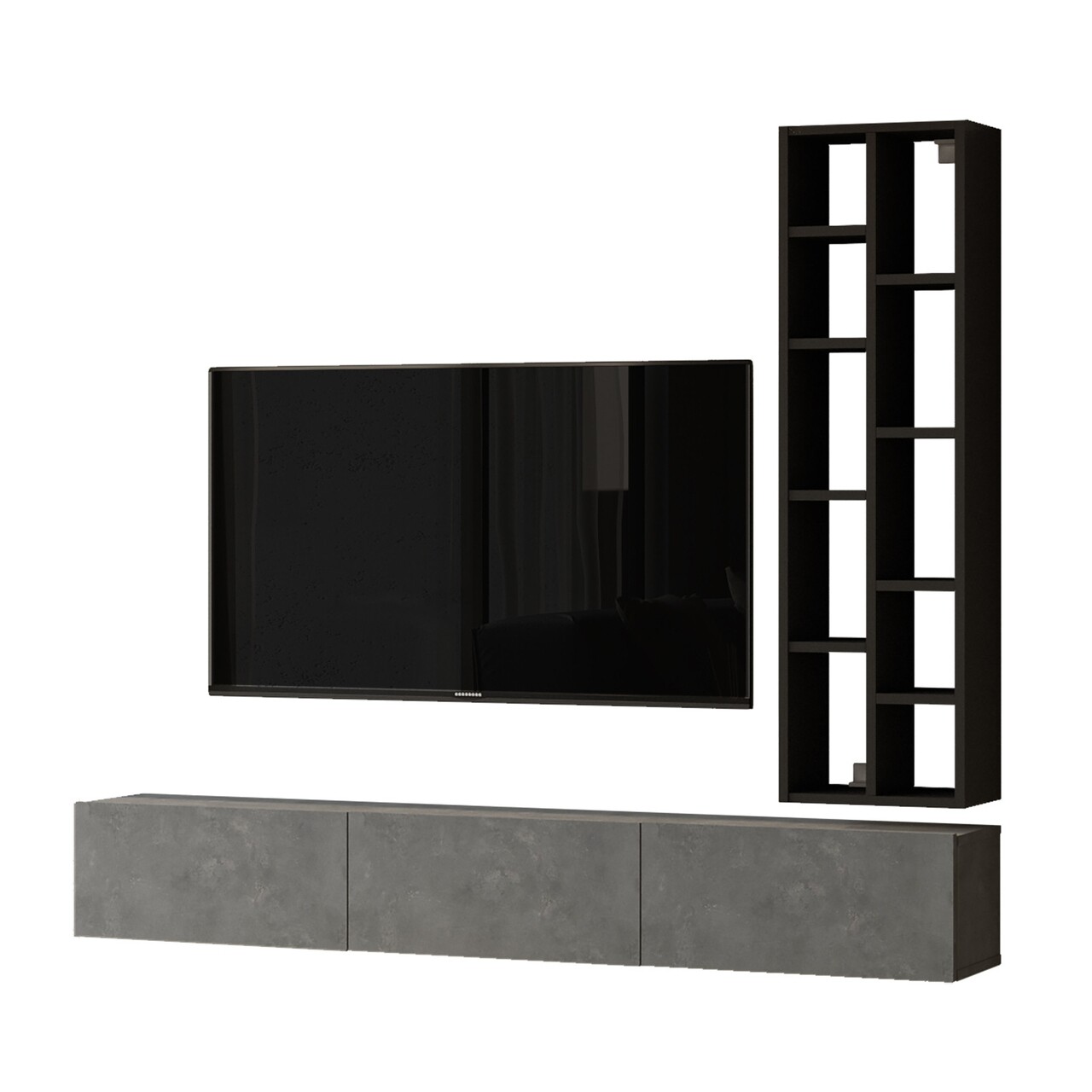 Setul este format din:Comoda TV: 174.6 x 27.3 x 25 cm (Lxlxh);Raft pentru perete: 34.4 x 22 x 120 cm (Lxlxh).Compozitie material: pal melaminat.Grosime: 1.8 cm.