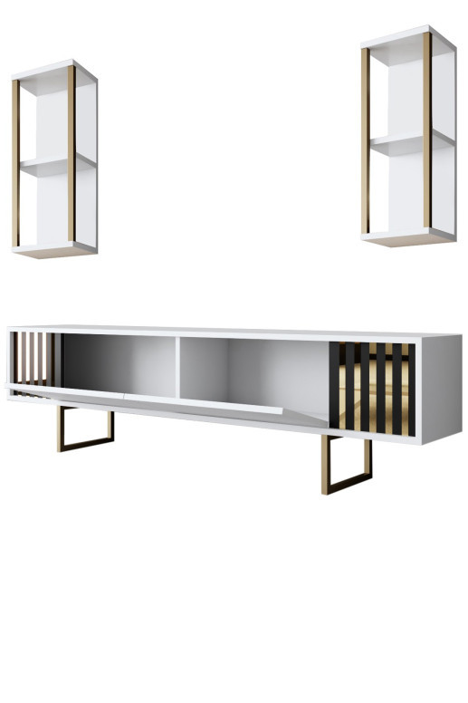 • 100% PAL melaminat •Grosime PAL: 18 mm •Picioare din metal •Înălțimea picioarelor: 18 cm •Dimensiuni Comodă TV: Lățime: 180 cm Adâncime: 30 cm Inălțime: 48 cm •Raft de perete: Lățime: 22 cm Adâncime: 21 cm Inălțime: 60 cm (2 Piese)