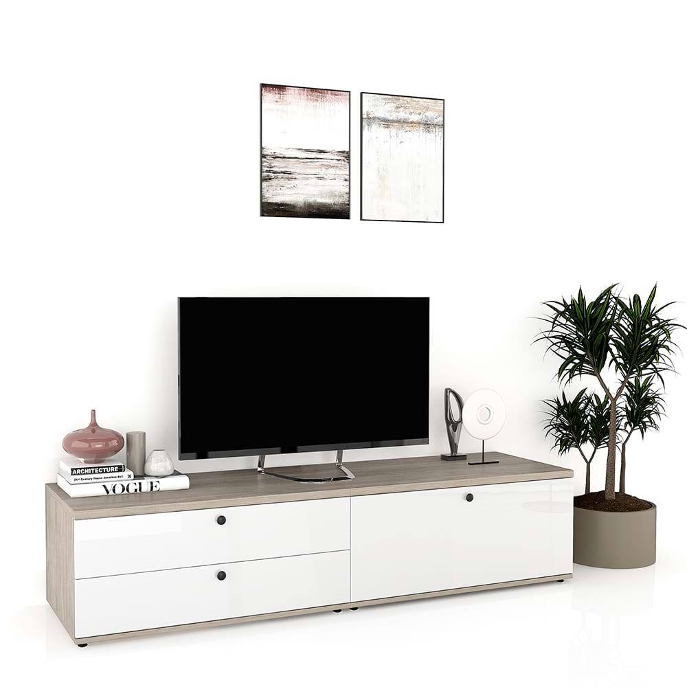 Comoda TV living CUBO 180, 1U, 2 sertare, Clasic, Oak, Alb Gloss