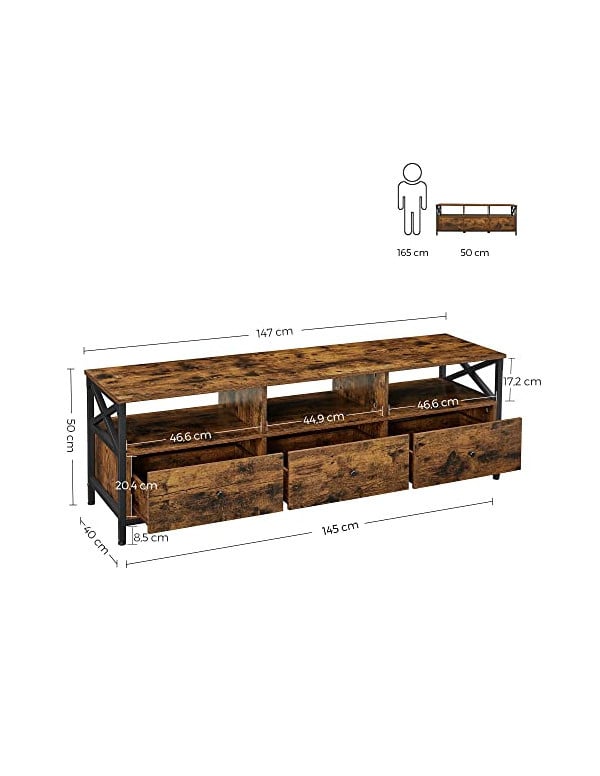 •Specificatii: •Culoare: Maro Rustic, Negru •Material: Metal •Dimensiuni:147x 40 x 50cm (L x W x H) •Greutate: 30.4kg •Pachetul contine:1 x Dulap TV- 1 x Kit de asamblare- 1 x Instrucțiuni