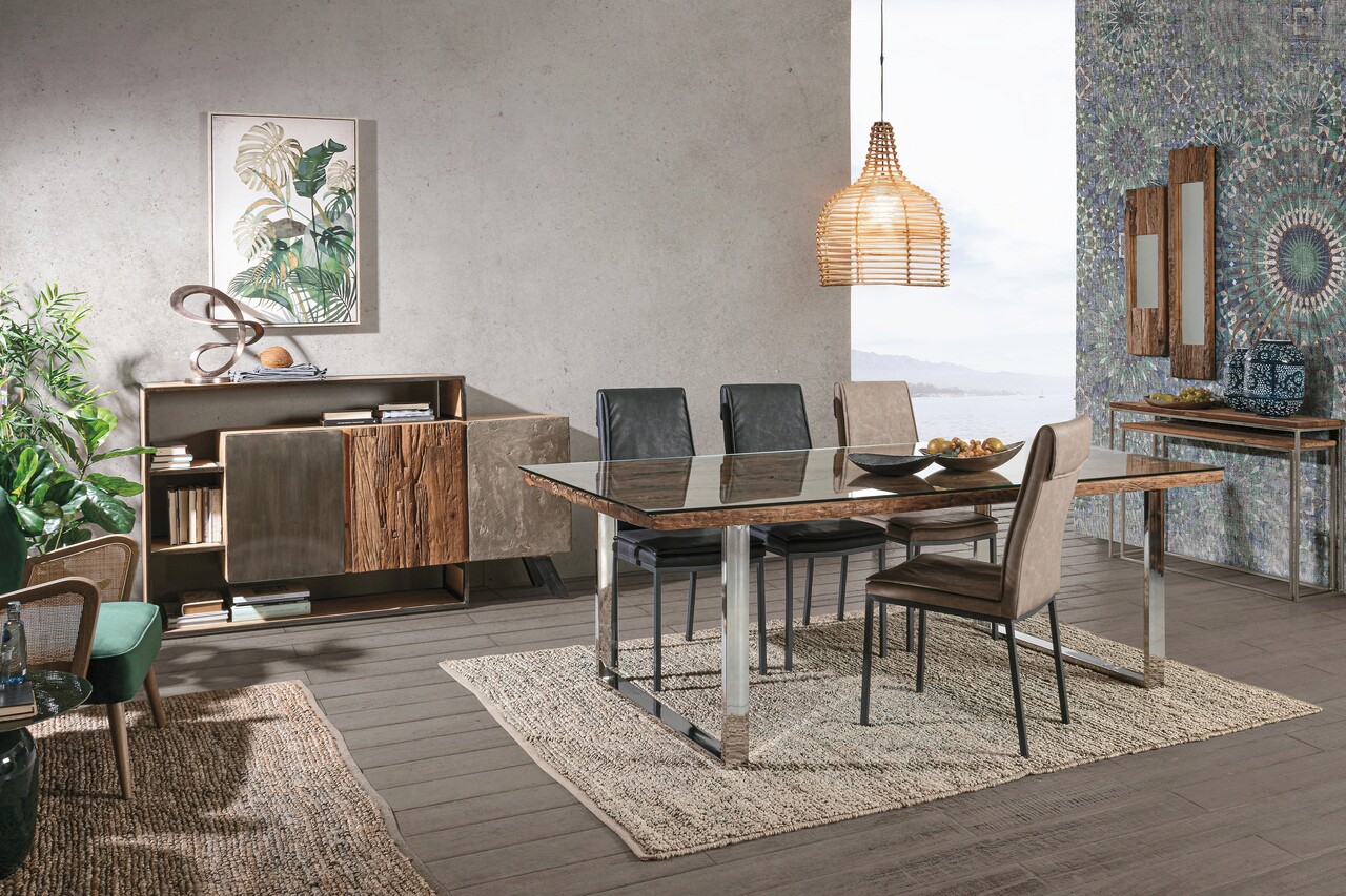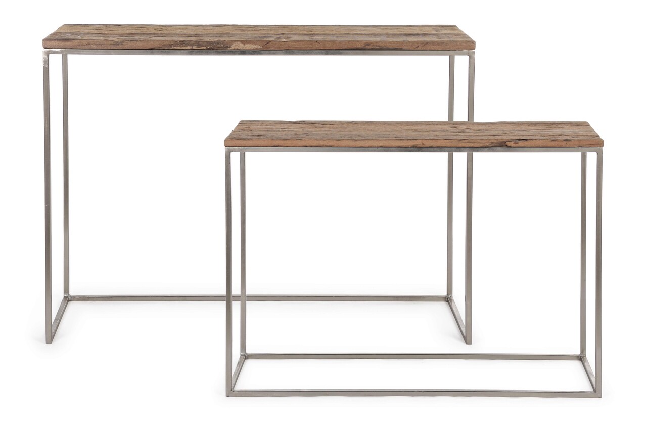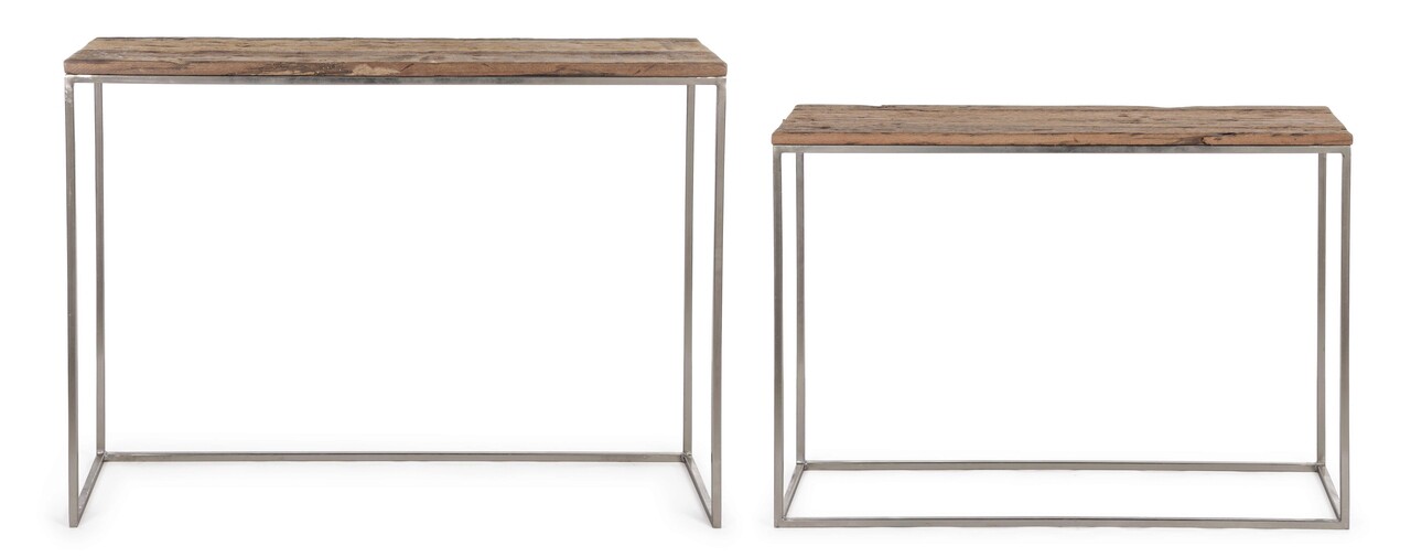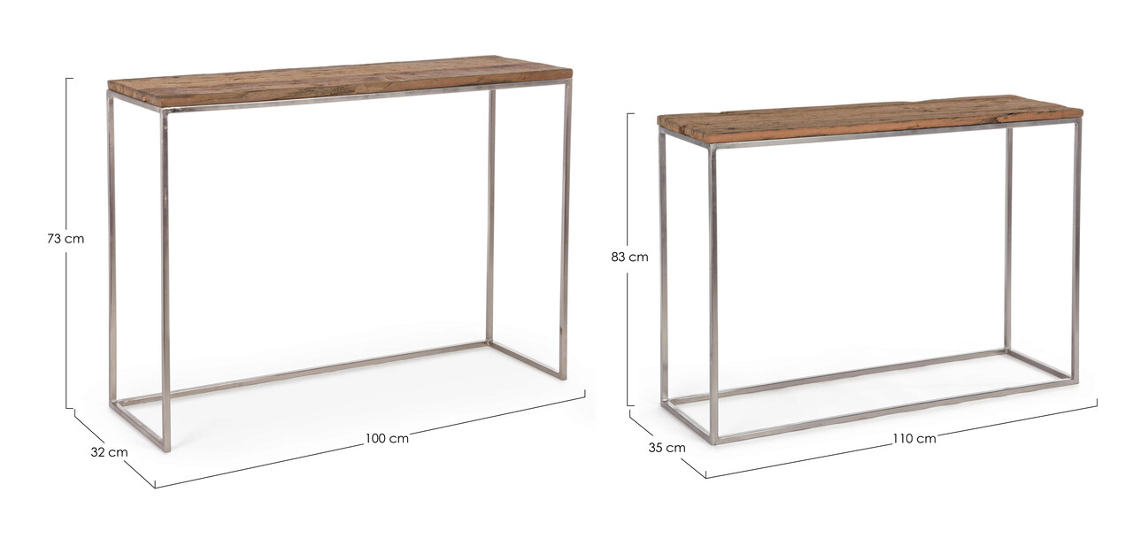 MentiuniCompozitie: cadru din otel cu finisaj din nichel, blat din lemn reciclat.Setul include1 consola cu dimensiunile 100 x 32 x 73 cm.1 consola cu dimensiunile 110 x 35 x 83 cm.