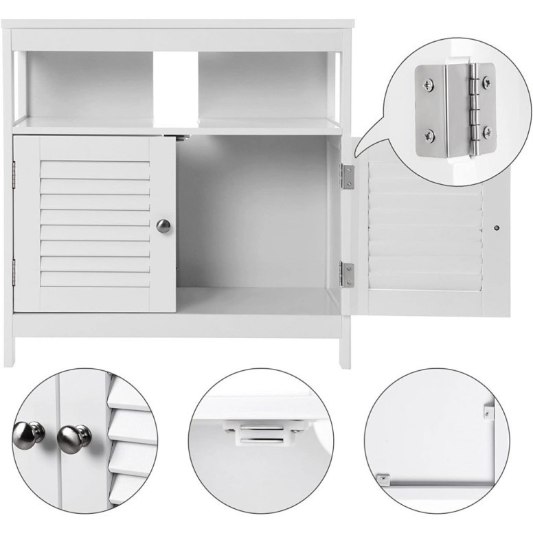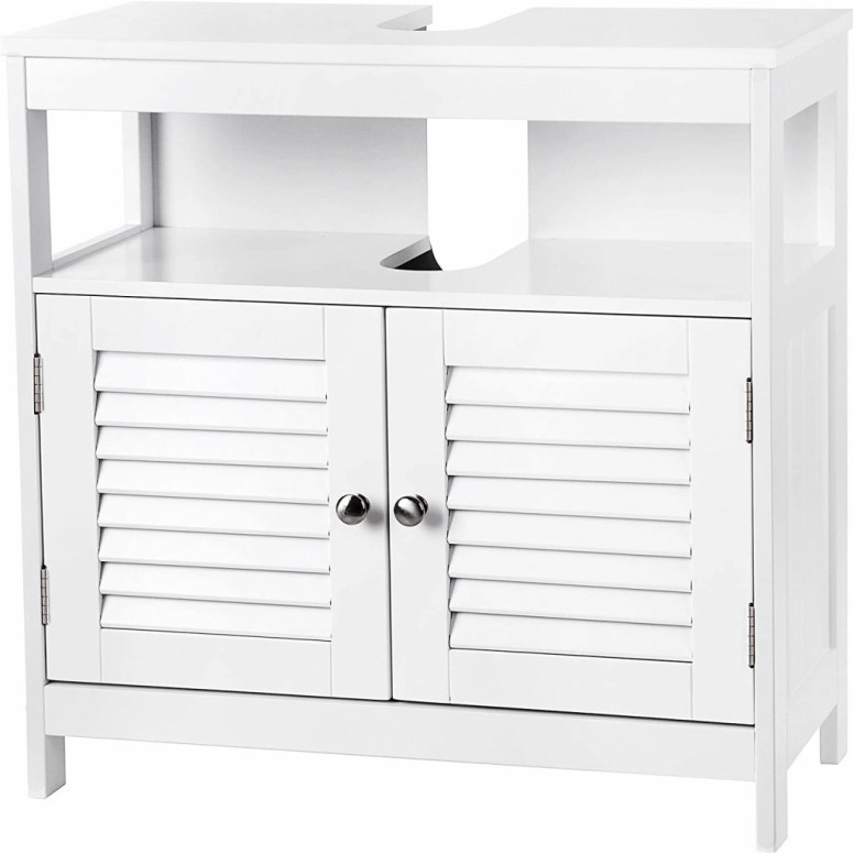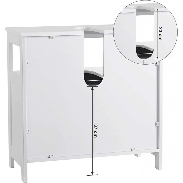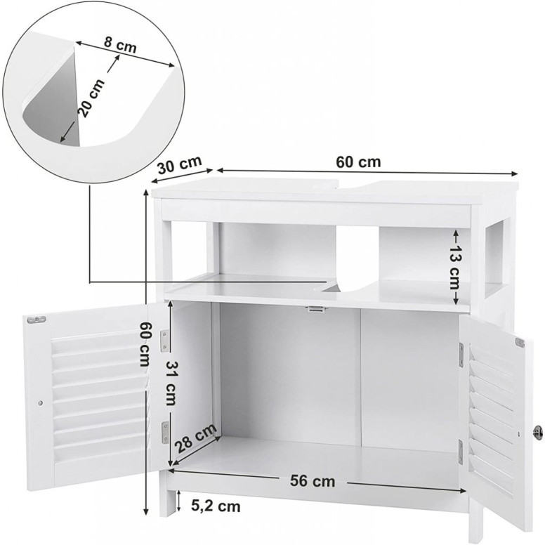 Dulap sub chiuvetă VASAGLE BBC02WT În partea superioară a dulapului se află un raft deschis potrivit pentru depozitarea prosoapelor sau a accesoriilor de baie. În spatele ușii din lamelă se află un raft care îți permite să pui deoparte lucruri pe care nu vrei să le ai tot timpul la vedere – hârtie igienică, produse de curățat, cosmetice etc. Materialul dulapului este rezistent la umiditate, de asemenea usor de curatat – dulap sub chiuveta din MDF (clasa E1), suprafata tratata cu vopsea, rezistent la umezeala si mucegai, de asemenea usor de curatat. ( Înainte de a cumpăra, vă rugăm să măsurați dimensiunea sifonului și să determinați dacă acest dulap se potrivește cu adevărat în baia dvs.!) Parametri: Dimensiuni: 60 x 60 x 30 cm (L x A x A) Dimensiunile nișei sifonului: 20 x 8 cm (Vă rugăm să măsurați dimensiunea sifonului înainte de a cumpăra și să indicați dacă acest dulap se potrivește. Material: placă MDF Culoare: alb Greutate totala: 10,6 kg