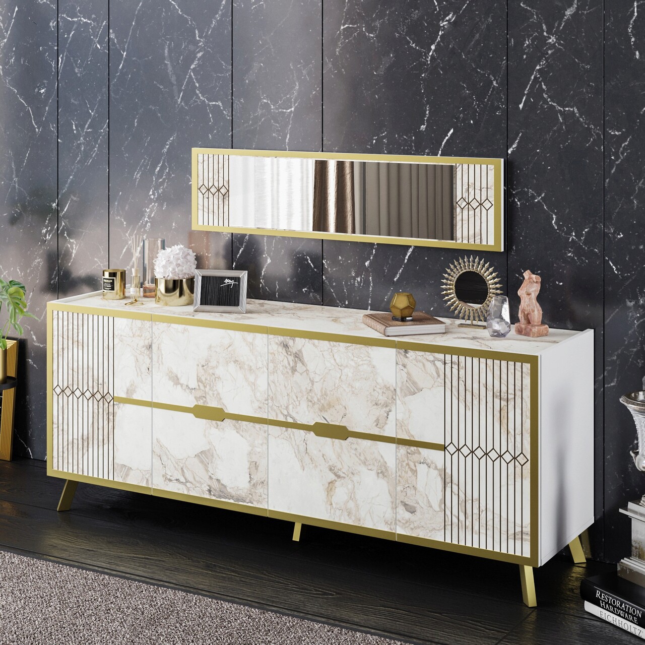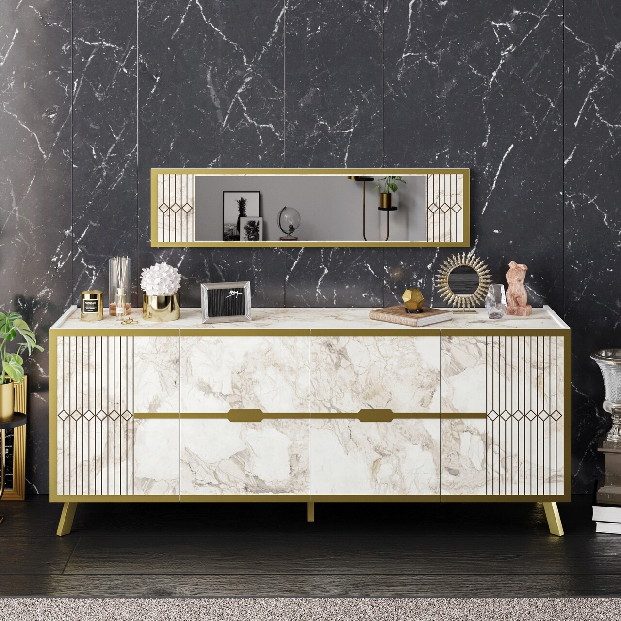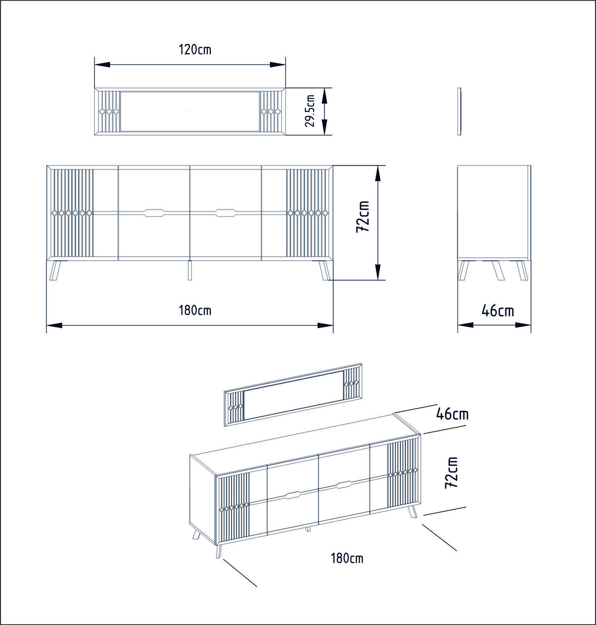 PALGrosime: 18 mmPicioare metaliceDimensiunea oglinzii: Latime: 120 cm Inaltime: 29,5 cmDimensiunea consolei: Latime:180 cm Inaltime: 72 cm Adancime: 46 cmRafturi numeroasePoate fi fixat pe perete