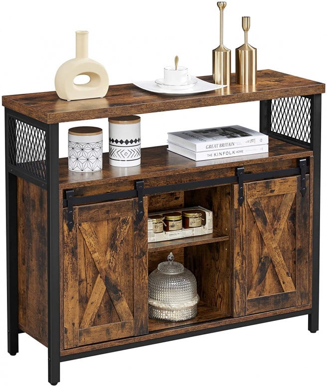 Specificații: Culoare: Maro rustic, Negru Material: Plăci PAL, Oțel Dimensiune produs: 100 x 33 x 80 cm (L x l x H) Greutate produs: 26,7 kg Max Sarcina statica a varfului: 15 kg Max Sarcina statica a raftului deschis: 15 kg Max Sarcina statică a raftului intern: 15 kg Conținutul pachetului: 1 x dulap de depozitare 1 x geantă de asamblare 1 x kit anti-răsturnare 1 x instrucțiuni (EN, DE, FR, ES, IT)