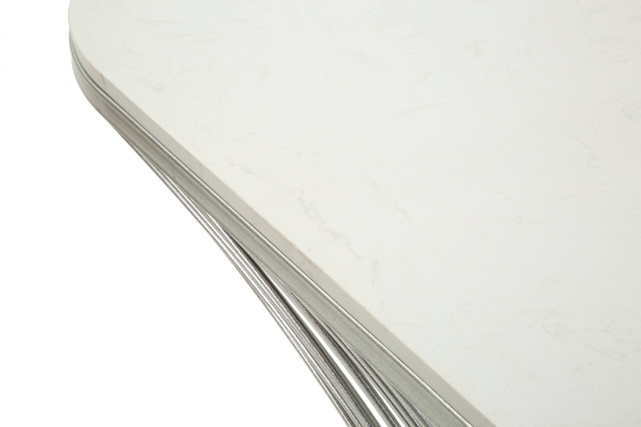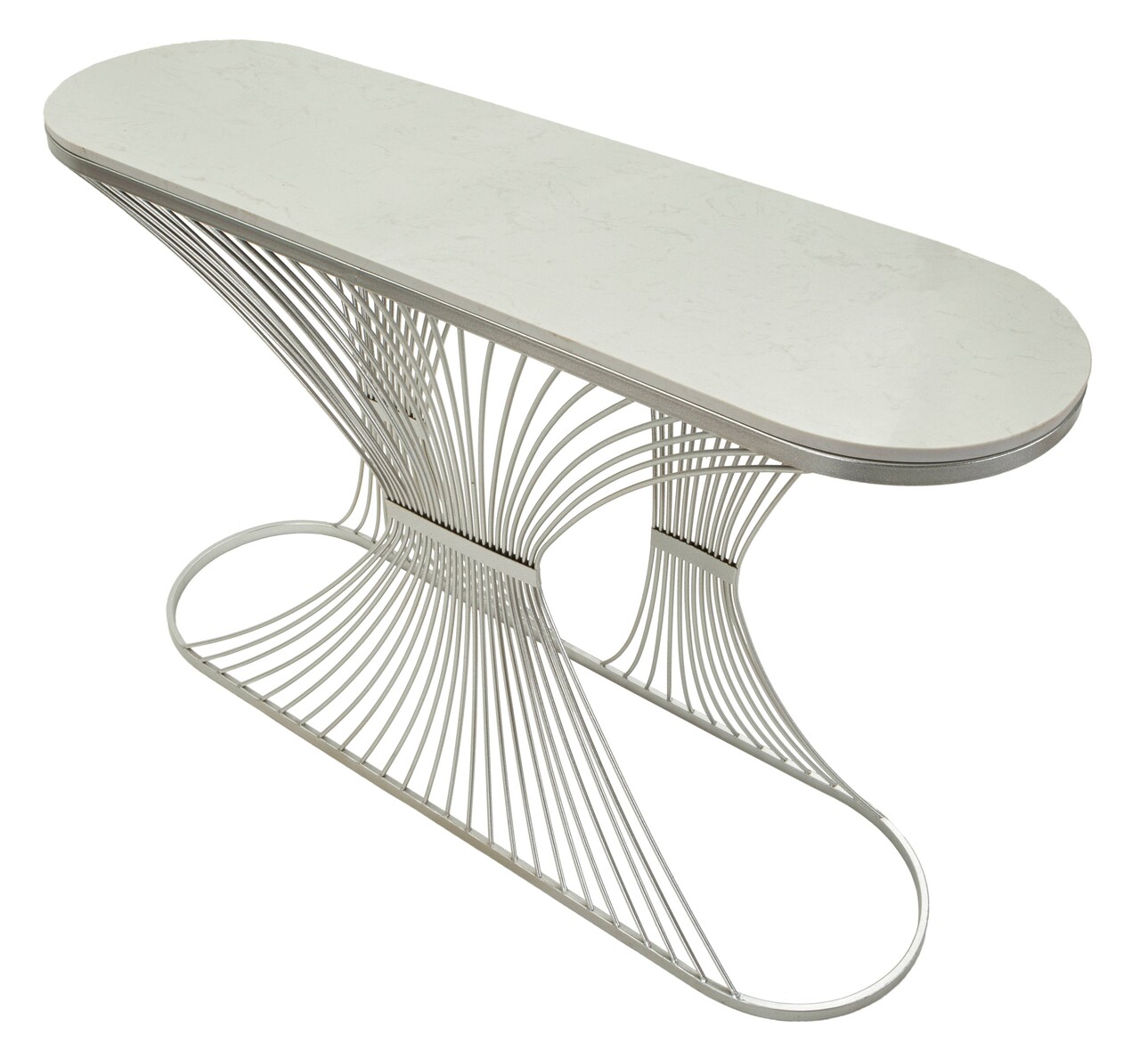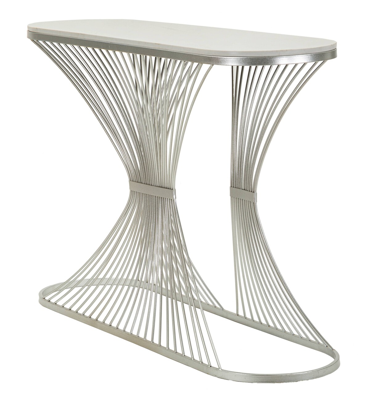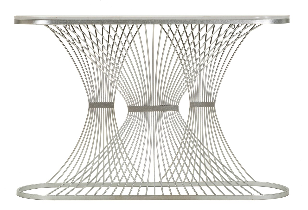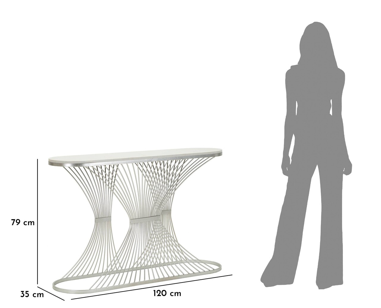 Consola din metal argintiu cu baza din linii impletite, care se unesc cu eleganta. Blatul din marmura, cu nervuri naturale, adauga o nota de rafinament.