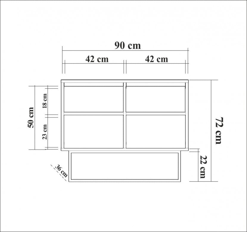 PAL Melaminat Grosime: 18 mm Picioare Metalice Dimensiune: Latime: 90 cm Inaltime: 72 cm Adancime: 36 cm Inaltime picior: 22 cm Inaltime raft: 18 cm Rafturi numeroase Poate fi fixat pe perete Depozitare suplimentară Ambalaj – Numar pachete: 3 41 x 98 x 15 cm / 14 kg (1 Piesa) 52 x 53 x 12 cm / 12 kg (1 Piesa) 16 x 35 x 16 cm / 2 kg (1 Piesa)