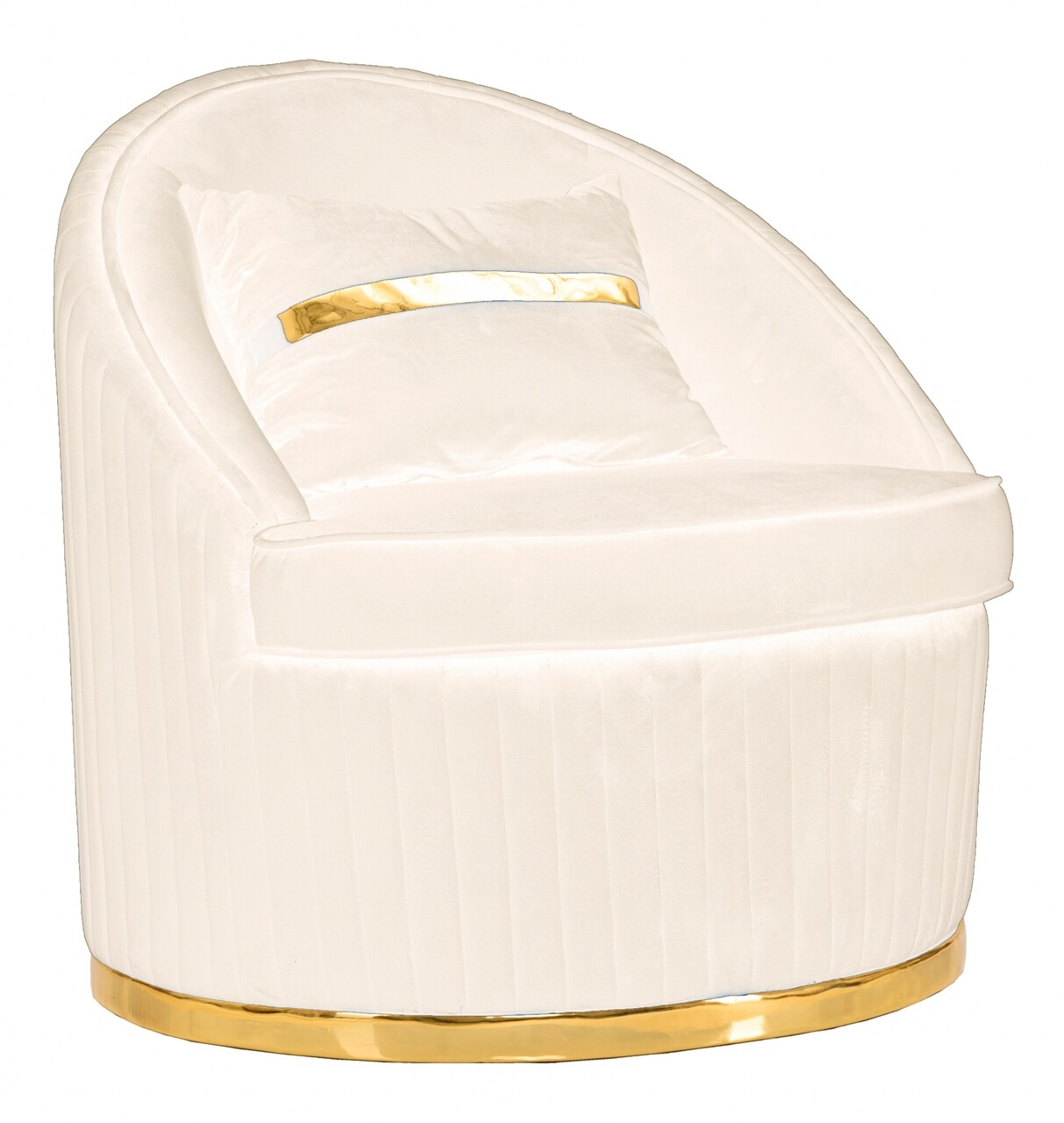 Fotoliu rotund elegant din material capitonat, cu spatar, cu linii simple si moderne, impodobit cu un decor elegant auriu la baza. Completat cu o perna cu decor geometric auriu.Compozitie material: lemn de pin, mdf, piele ecologica.