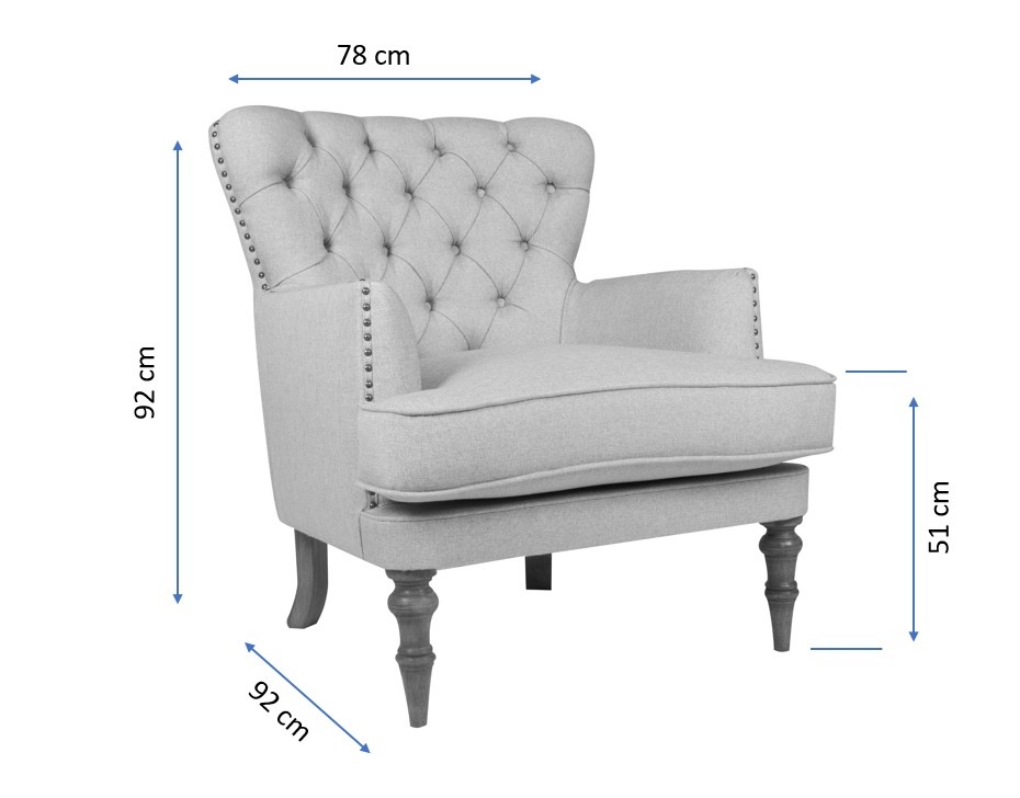 Cadru: lemn de molid Tesatura: 100% poliester Latime: 78 cm Inaltime: 92 cm Adancime: 92 cm Inaltime sezut: 51 cm Tesatura usor de curatat Picioare din lemn Număr de pachete: 1 83 x 78 x 92 cm / 19 kg (1 bucată)