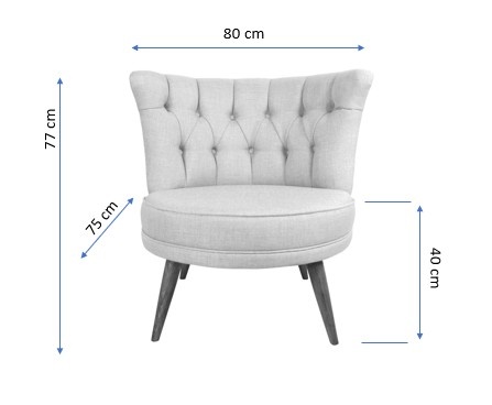 Cadru: lemn de molid Tesatura: 100% poliester 32 DNS Spuma pentru sezut Latime: 80 cm Inaltime: 77 cm Adancime: 75 cm Inaltime sezut: 40 cm Tesatura usor de curatat Picioare din lemn Număr de pachete: 1 80 x 73 x 80 cm / 13 kg (1 bucată)