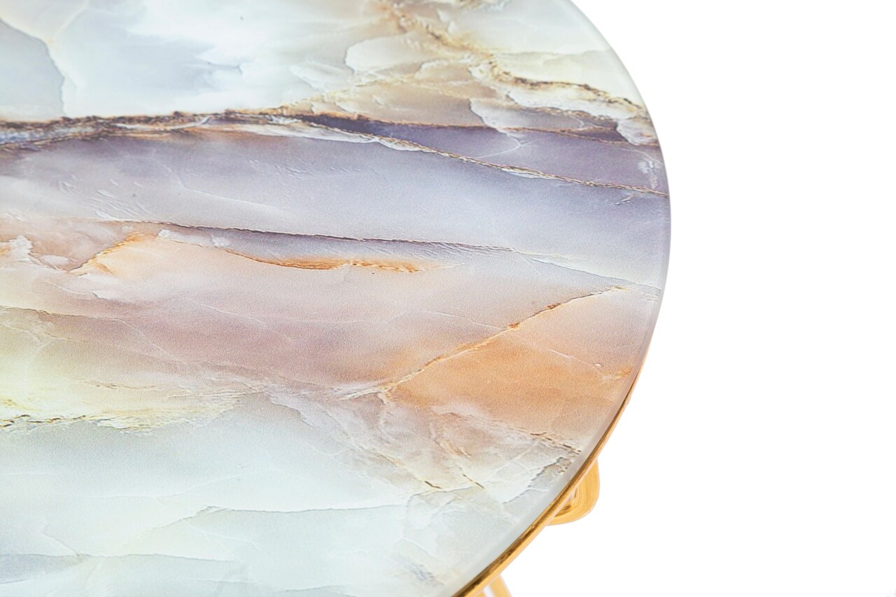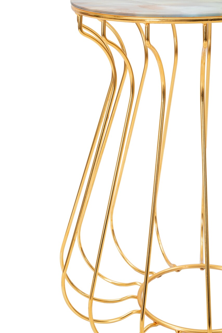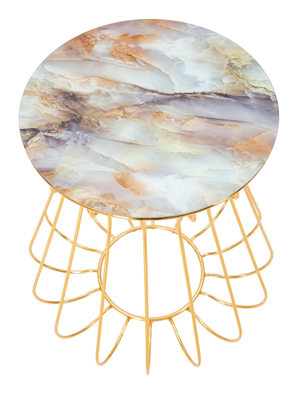 <p>Masuta rotunda mica din metal auriu cu blat din sticla cu prelucrare asemanatoare marmurei. Designul geometric combinat cu aurul si coloritul deosebit al blatului creeaza un contrast delicat, plin de clasa si eleganta. <br />Compozitie material: fier, sticla cu aspect de marmura</p>