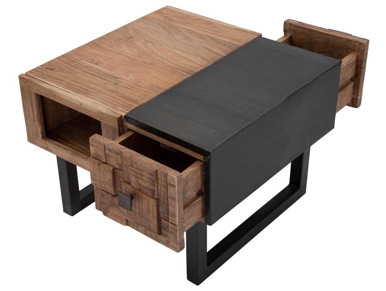 <p>Masuta de cafea din lemn cu manere si picioare metalice. Stilul industrial combinat cu insertiile pretioase ii dau o nota de eleganta si rafinament.<br />Inaltime picioare: 13.5 cm<br />Dimensiuni sertar: 19 x 22 x 13 cm<br />Compozitie material: lemn de salcam, fier</p>