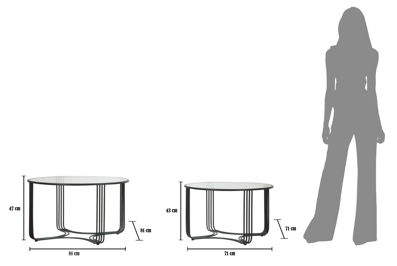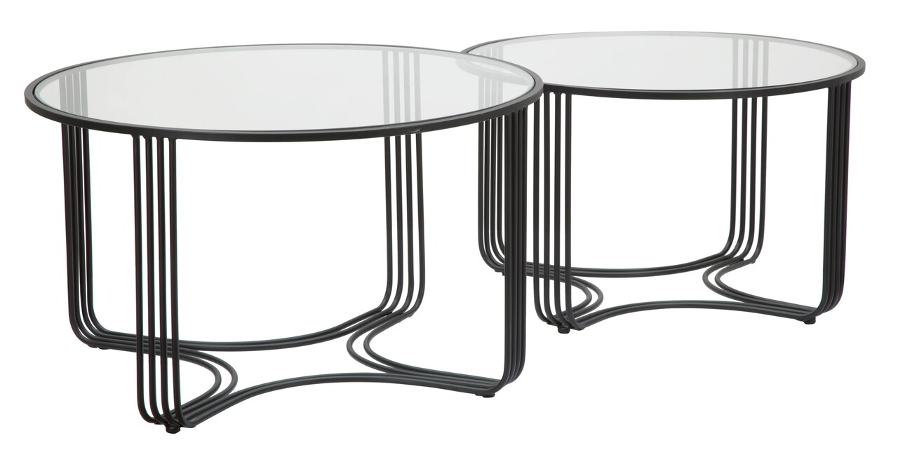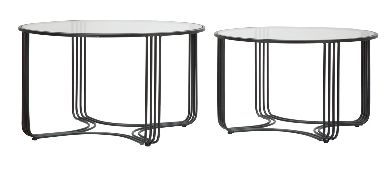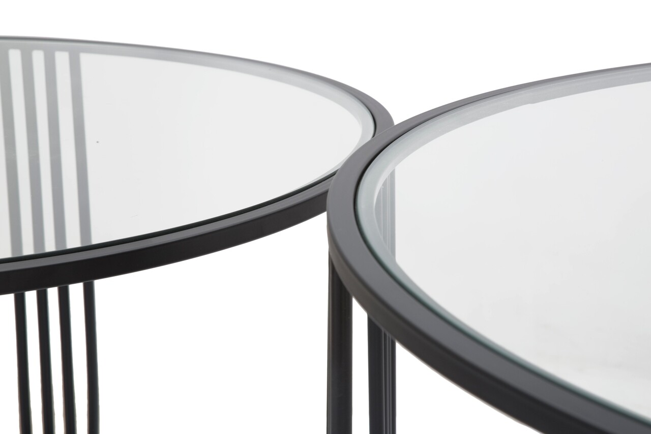 <p>Setul include:<br />1 masuta de cafea Ø 81×47 cm<br />1 masuta de cafea Ø 71×43 cm<br /><br />Compozitie material: fier, sticla<br />Dimensiuni sticla: Ø 78 cm, Ø68 cm</p>