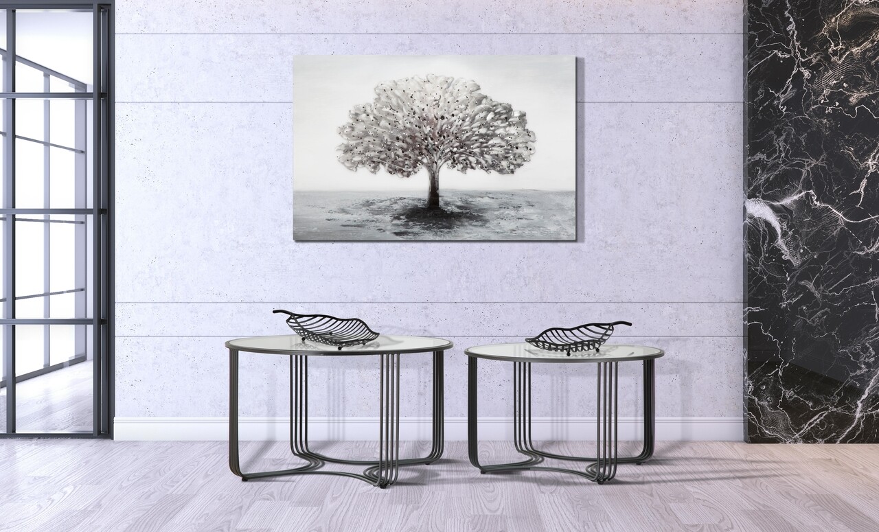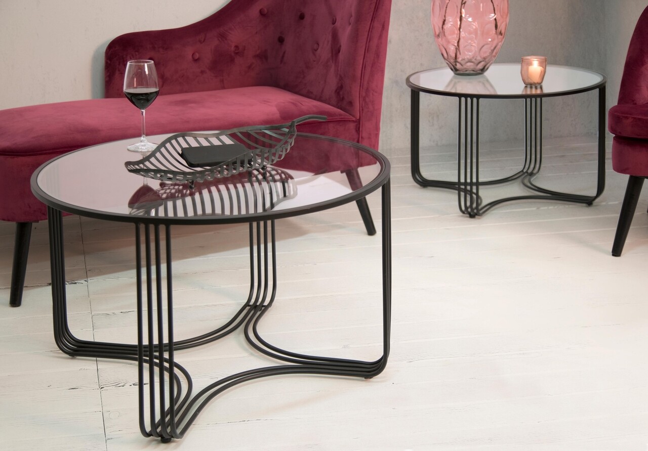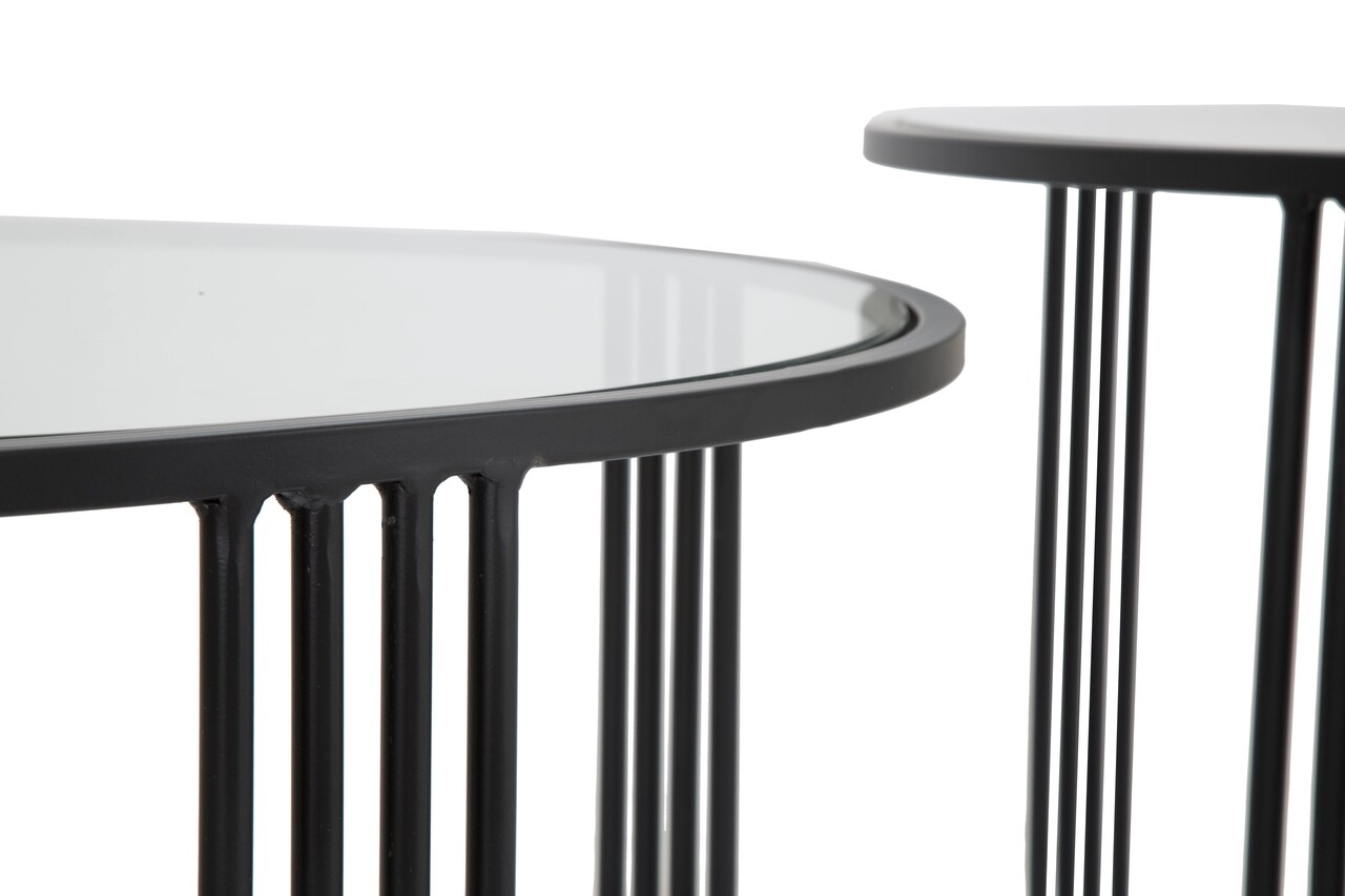 <p>Setul include:<br />1 masuta de cafea Ø 81×47 cm<br />1 masuta de cafea Ø 71×43 cm<br /><br />Compozitie material: fier, sticla<br />Dimensiuni sticla: Ø 78 cm, Ø68 cm</p>