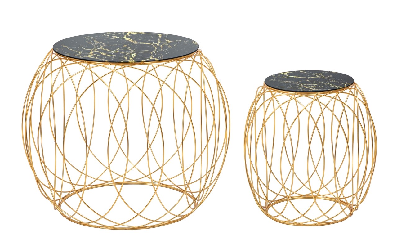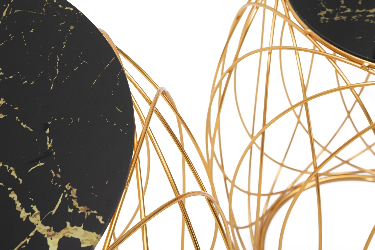 <p>Set de doua mese rotunde din metal auriu cu blat din sticla cu prelucrare asemanatoare marmurei. Designul liniar si contrastul dintre auriu si negru creeaza un efect elegant si deosebit de stilat. <br /><strong>Mentiuni:</strong><br />Compozitie material: fier, MDF, oglinda<br />Setul include:<br />1 masuta de cafea cu dimensiunile Ø 68×56 cm<br />1 masuta de cafea cu dimensiunile Ø 43×45 cm</p>