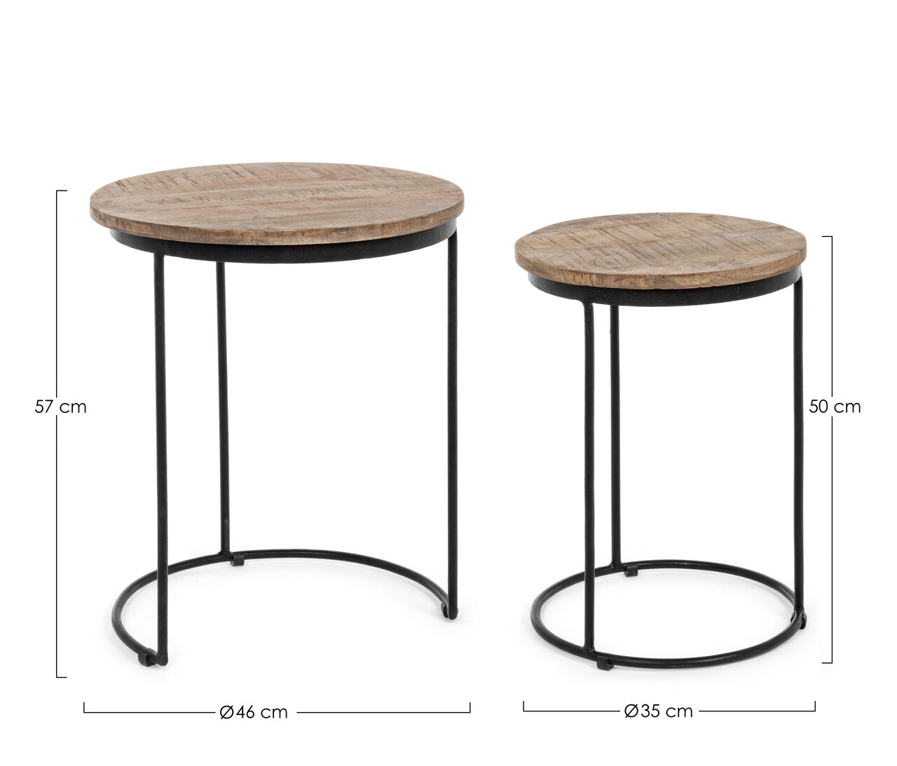 <p><strong>Mentiuni</strong><br />Cadru din otel acoperit cu pulbere epoxidica.<br />Blat din lemn de mango cu finisare cu vopsea pe baza de apa.<br /><br /><strong>Setul include</strong><br />1 masuta de cafea cu dimensiunile Ø35 x 50 cm.<br />1 masuta de cafea cu dimensiunile Ø46 x 57 cm.</p>