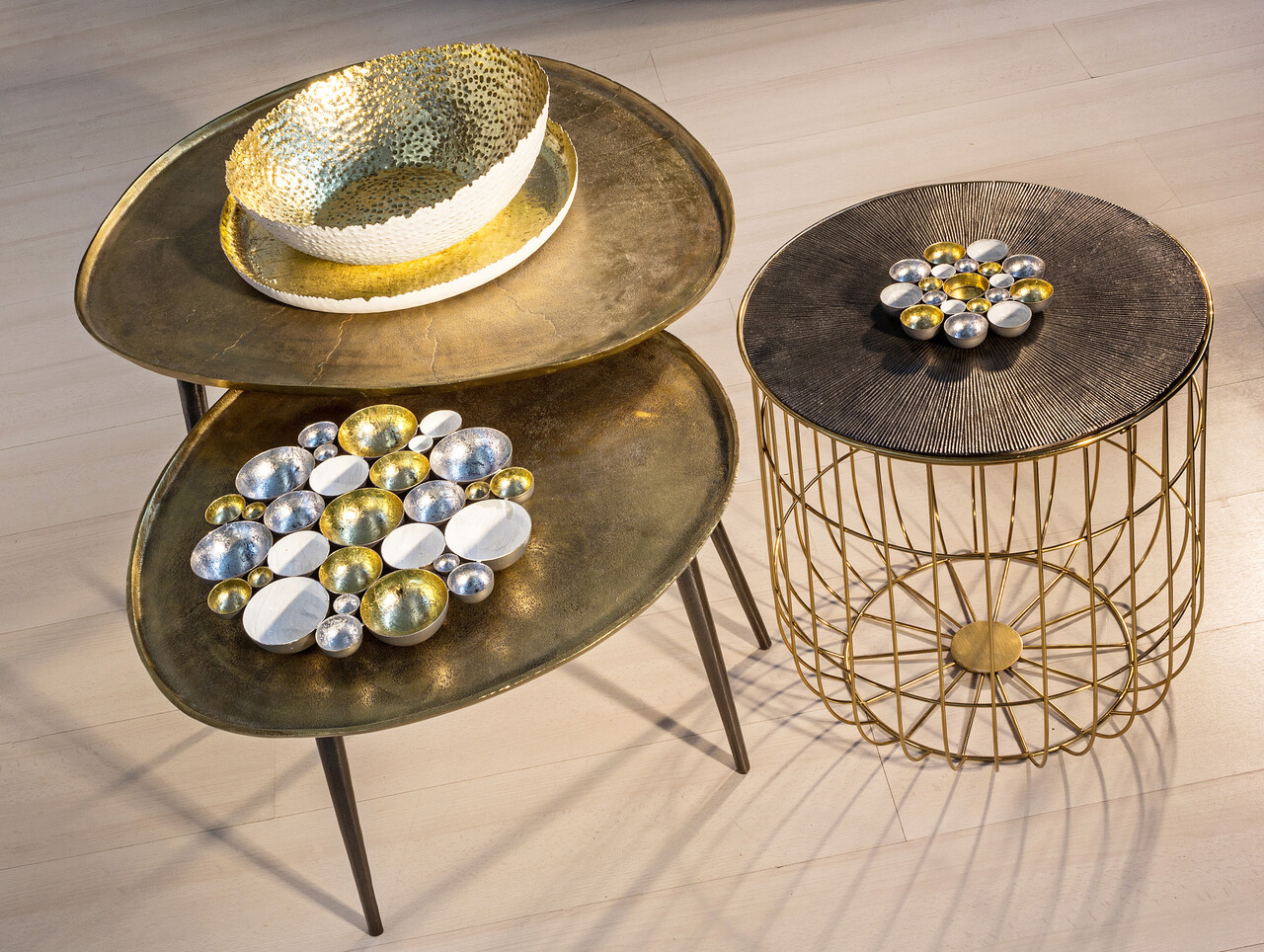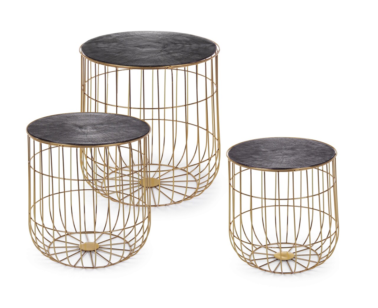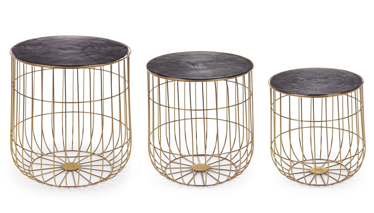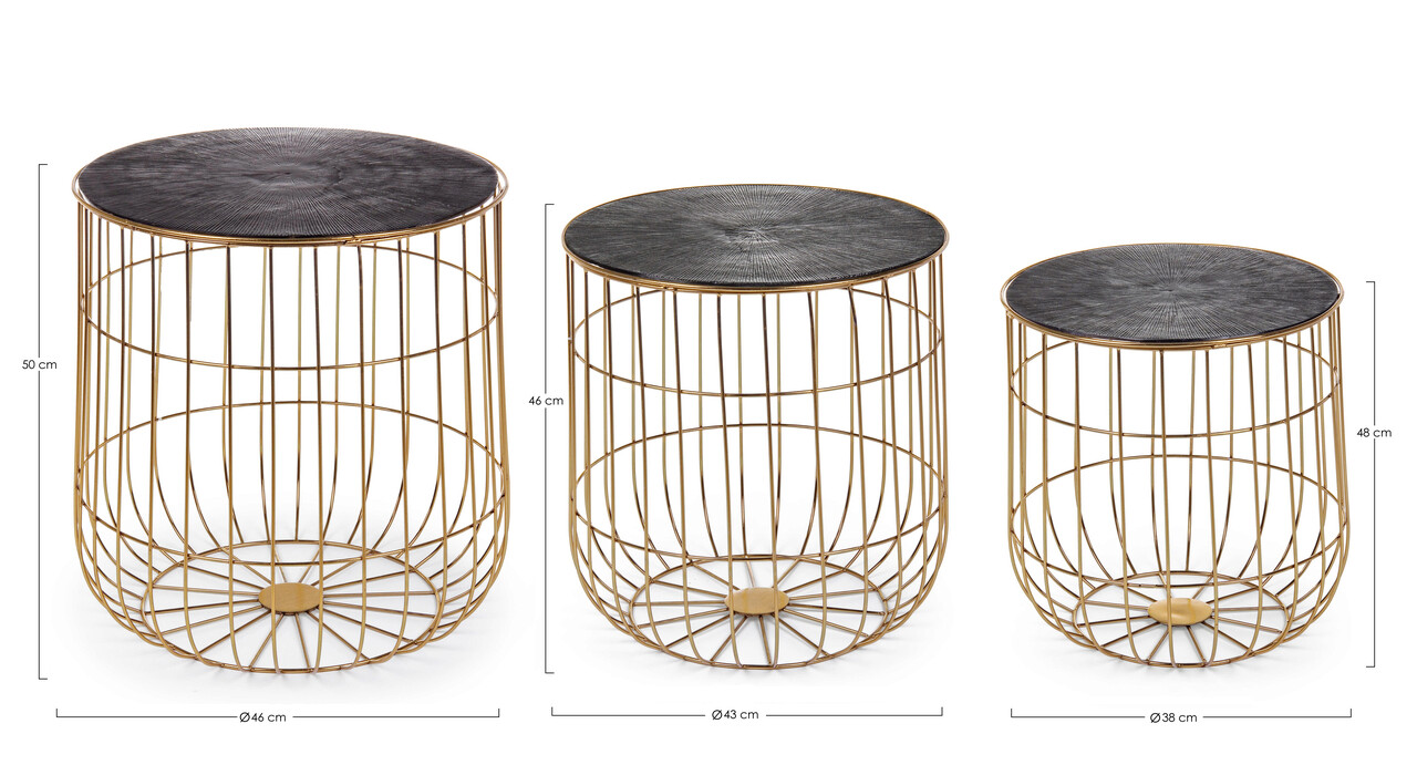 <p><strong>Mentiuni</strong><br />Baza din otel, partea superioara detasabila din aluminiu cu finisaj placat si antichizat.<br /><br /><strong>Setul include</strong><br />1 masuta de cafea cu dimensiunile Ø38 x 40 cm.<br />1 masuta de cafea cu dimensiunile Ø43 x 46 cm.<br />1 masuta de cafea cu dimensiunile Ø46 x 50 cm.</p>
