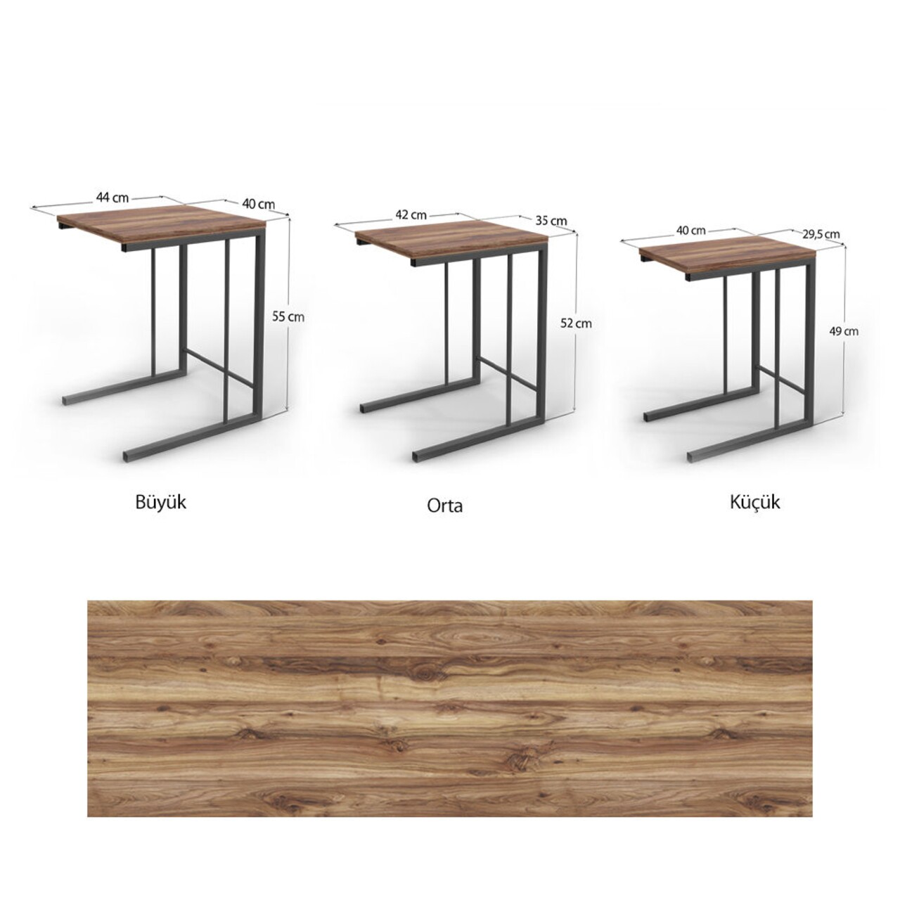 <p>Setul este format din:<br />Masuta: Lungime: 44 cm; Latime: 40 cm; Inaltime: 55 cm.<br />Masuta: Lungime: 42 cm; Latime: 35 cm; Inaltime: 52 cm.<br />Masuta: Lungime: 40 cm; Latime: 29.5 cm; Inaltime: 49 cm.<br />Compozitie material: pal melaminat, rama din metal.<br />Grosime: 1.8 cm.</p>