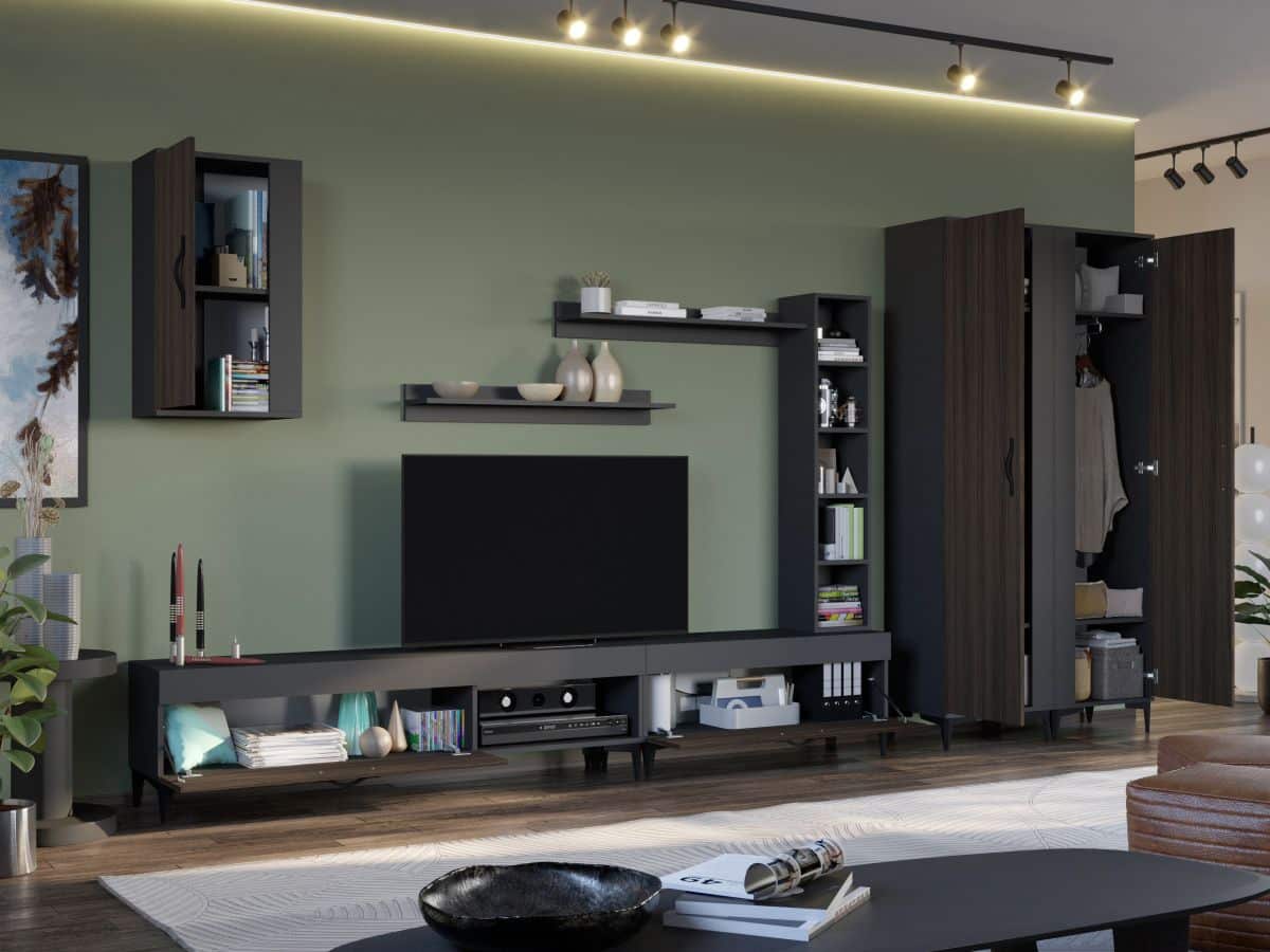Living Azur C12 – Mobila sufragerie Living Azur C12 – Mobila sufragerie face parte din familia de mobila pentru sufragerie / living Azur . Aceasta colectie este alcatuita din mai multe module, care, prin combinatiile de materiale si culori, denota o eleganta si un rafinament aparte. Puteti alege direct din configuratiile realizate de noi sau, daca doriti, puteti creea singuri propria configuratie de living combinand corpurile de mobila astfel incat sa se potriveasca perfect in spatiul dorit. Livrare gratuita si rapida, 4-10 zile lucratoare prin flota proprie Suntem producatori de mobilier, fara intermediari Toate piesele de mobilier au o garantie de 2 ani Living Azur C12 – Mobila sufragerie Corpurile din gama Living Azur sunt construite din PAL melaminat de 16mm cu finisaj Gri Antracit si Nuc care, impreuna cu manerele si picioarele negre , creeaza un ambient primitor si o atmosfera placuta. Cantul aplicat este unul de 0,6 care le permite muchiilor sa fie placute la atingere. Atentie! Elementele de prindere de tipul dibluri, surub sau horsurub nu sunt incluse deoarce tipul de prindere difera in functie de tipul peretelui pe care urmeaza a se monta mobilierul (beton, caramida, BCA, rigips, lemn etc). Video de prezentare familie Videoclipul de prezentare poate contine mai putine sau mai multe corpuri de mobilier in comparatie cu produsul de pe aceasta pagina. Scopul acestui video este de a detalia aspectul materialelor, accesoriilor cat si a familiei din care face parte. Dimensiuni Living Azur C12 Imaginea alaturata prezinta compartimentarea pentru Living Azur C12 – Mobila sufragerie . Aceasta configuratie are 11 corpuri modulare , 7 suspendate si 4 pe sol. Spatii de depozitare cu usa cat si etajere si polite. Dulapurile au bare de haine. Dimensiuni corpuri componente: 2 x Dulap Haine: L 51.6 x A 35.1 x H 192.4 cm – Schita Montaj Comoda TV 1000: L 100 x A 33.5 x H 43.7 cm – Schita Montaj Comoda TV 1600: L 160 x A 33.5 x H 43.7 cm – Schita Montaj Corp Superior: L 43.9 x A 26.6 x H 77 cm – Schita Montaj Corp Decorativ cu Polite: L 120 x A 22 x H 25 cm – Schita Montaj Set 2 Polite Suspendate: L 91.8 x A 18.6 x H 12 cm – Schita Montaj Inaltime picioare 12cm, este inclusa in dimensiunile corpurilor si dimensiunea totala. Dimensiuni totale livin L 390 x A 35.1 x H 192.4 cm (inaltimea poate varia in functie de inaltimea pentru care optati atunci cand suspendati corpurile superioare) Spatiul de TV: diagonala recomandata maxima 180cm/70″ Toate corpurile se pot pune pe stanga sau pe dreapta in functie de cum doriti. Nu este obligatoriu pozitionarea ca in prezentare. Ele nu sunt prinse unul de celalalt. Pretul afisat nu include alte accesorii sau obiecte de decor (TV, tablouri, elemente de iluminat, covor etc.) Dimensiunile sunt exprimate in cm si pot oscila intre ± 10 mm. Living Azur C12 – Mobila sufragerie se livreaza demontat si este insotit de accesorii si instructiuni de asamblare.