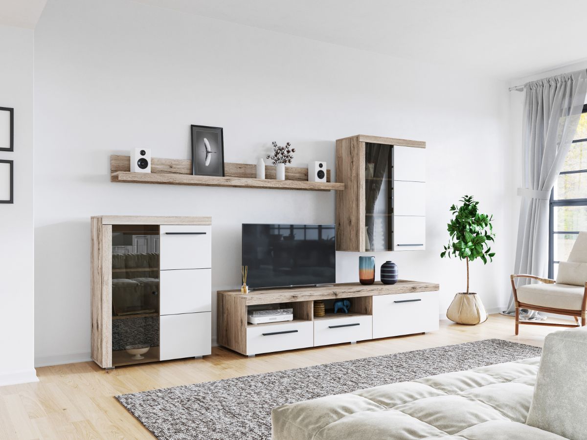 Living Balance Configuratia 1 Living Balance Configuratia 1 face parte dintr-o categorie de mobilier modern, contemporan ce imbina designul cu utilitatea. Este compus din corpuri modulare si poate fi comandat direct configurat sau pe corpuri. Livrare gratuita si rapida, 4-10 zile lucratoare prin flota proprie Suntem producatori de mobilier, fara intermediari Toate piesele de mobilier au o garantie de 2 ani Mobila Sufragerie Balance Corpurile sunt construite din PAL melaminat cu grosimea de 16mm cu finisaj San Remo si Alb . O combinatie de nuante in voga ce creeaza un ambient placut alaturi de elemntele de sticla si manerele negre. Cantul aplicat este unul de 0,6 care le permite muchiilor sa fie placute la atingere fiind finisate si atent retusate. Atentie! Elementele de prindere de tipul dibluri, surub sau horsurub nu sunt incluse deoarce tipul de prindere difera in functie de tipul peretelui pe care urmeaza a se monta mobilierul (beton, caramida, BCA, rigips, lemn etc). Video de prezentare familie Videoul de prezentare poate contine mai multe corpuri de mobilier sau mai putine in comparatie cu produsul de pe aceasta pagina. Scopul acestui video este de a detalia aspectul materialelor, accesoriilor cat si a familiei din care face parte. Dimensiuni Living Balance Configuratia 1 Imaginea alaturata prezinta compartimentarea pentru Living Balance Configuratia 1 . Aceasta configuratie are 4 corpuri modulare , 2 suspendate si 2 nesuspendate si spatii de depozitare cu usa, cat si etajere si polite. Dimensiuni corpuri componente: 2 x Comoda inalta Balance – Modul D : L 79 x A 38.4 x H 102.4 cm – Schita Montaj Comoda Tv Balance – Modul C : L 198 x A 55.6 x H 42.4 cm – Schita Montaj Polita mare Balance – Modul E : L 198 x A 25.6 x H 22.3 cm – Schita Montaj Dimensiuni totale livin L 277 x A 55.6 x H 199.8 cm (inaltimea poate varia in functie de inaltimea pentru care optati atunci cand suspendati corpurile superioare) Spatiul de TV: diagonala recomandata maxima 120cm / 48″ ( latime spatiu TV 119 cm ) Toate corpurile se pot pune pe stanga sau pe dreapta in functie de cum doriti. Nu este obligatoriu pozitionarea ca in prezentare. Ele nu sunt prinse unul de celalalt. Pretul afisat nu include alte accesorii sau obiecte de decor (TV, tablouri, elemente de iluminat, covor etc.) Dimensiunile sunt exprimate in cm si pot oscila intre ± 10 mm. Produsul se livreaza demontat si este insotit de accesorii si instructiuni de asamblare.