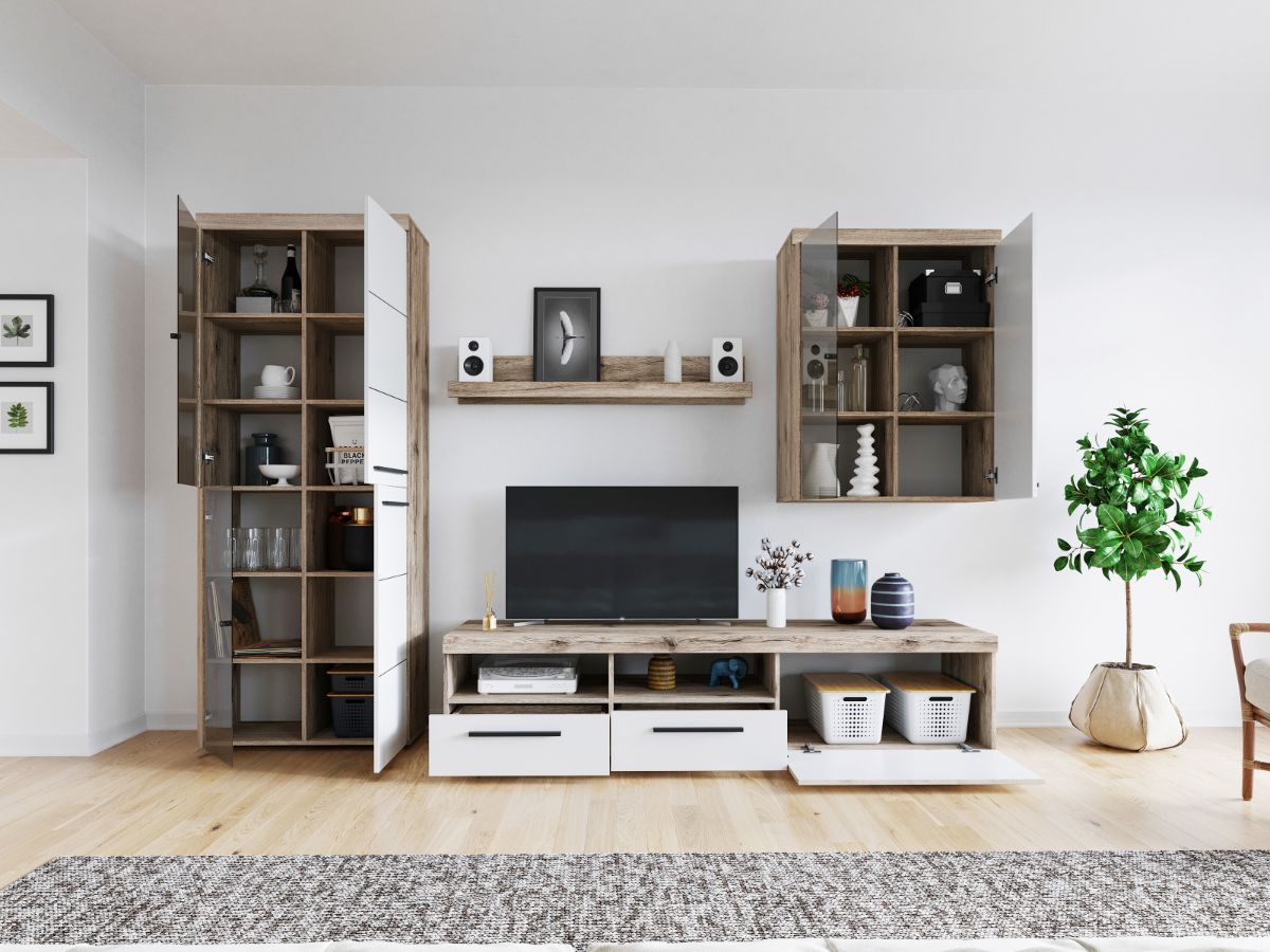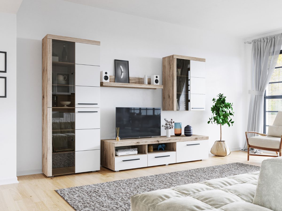 Living Balance Configuratia 6 Living Balance Configuratia 6 face parte dintr-o categorie de mobilier modern, contemporan ce imbina designul cu utilitatea. Este compus din corpuri modulare si poate fi comandat direct configurat sau pe corpuri. Livrare gratuita si rapida, 4-10 zile lucratoare prin flota proprie Suntem producatori de mobilier, fara intermediari Toate piesele de mobilier au o garantie de 2 ani Mobila Sufragerie Balance Corpurile sunt construite din PAL melaminat cu grosimea de 16mm cu finisaj San Remo si Alb . O combinatie de nuante in voga ce creeaza un ambient placut alaturi de elemntele de sticla si manerele negre. Cantul aplicat este unul de 0,6 care le permite muchiilor sa fie placute la atingere fiind finisate si atent retusate. Atentie! Elementele de prindere de tipul dibluri, surub sau horsurub nu sunt incluse deoarce tipul de prindere difera in functie de tipul peretelui pe care urmeaza a se monta mobilierul (beton, caramida, BCA, rigips, lemn etc). Video de prezentare familie Videoul de prezentare poate contine mai multe corpuri de mobilier sau mai putine in comparatie cu produsul de pe aceasta pagina. Scopul acestui video este de a detalia aspectul materialelor, accesoriilor cat si a familiei din care face parte. Dimensiuni Living Balance Configuratia 6 Imaginea alaturata prezinta compartimentarea pentru Living Balance Configuratia 6 . Aceasta configuratie are 6 corpuri modulare , 3 suspendate si 3 nesuspendate si spatii de depozitare cu usa, cat si etajere si polite. Dimensiuni corpuri componente: Vitrina Balance – Modul A : L 79 x A 38.4 x H 199.8 cm – Schita Montaj Comoda Tv Balance – Modul C : L 198 x A 55.6 x H 42.4 cm – Schita Montaj Comoda inalta Balance – Modul D : L 79 x A 38.4 x H 102.4 cm – Schita Montaj Polita mica Balance – Modul F : L 119.2 x A 23.2 x H 20 cm – Schita Montaj Dimensiuni totale livin L 277 x A 55.6 x H 199.8 cm (inaltimea poate varia in functie de inaltimea pentru care optati atunci cand suspendati corpurile superioare) Spatiul de TV: diagonala recomandata maxima 120cm / 48″ ( latime spatiu TV 119 cm ) Toate corpurile se pot pune pe stanga sau pe dreapta in functie de cum doriti. Nu este obligatoriu pozitionarea ca in prezentare. Ele nu sunt prinse unul de celalalt. Pretul afisat nu include alte accesorii sau obiecte de decor (TV, tablouri, elemente de iluminat, covor etc.) Dimensiunile sunt exprimate in cm si pot oscila intre ± 10 mm. Produsul se livreaza demontat si este insotit de accesorii si instructiuni de asamblare.