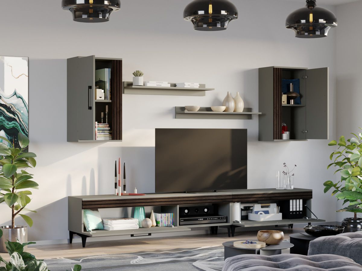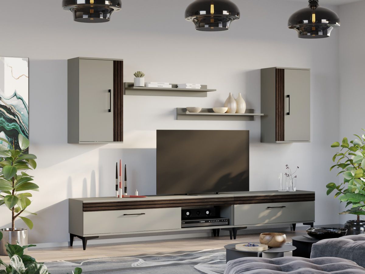 Living Nori C01 – Mobila sufragerie Living Nori C01 – Mobila sufragerie face parte din familia de mobila pentru sufragerie / living Nori . Aceasta colectie este alcatuita din mai multe module, care, prin combinatiile de materiale si culori, denota o eleganta si un rafinament aparte. Puteti alege direct din configuratiile realizate de noi sau, daca doriti, puteti creea singuri propria configuratie de living combinand corpurile de mobila astfel incat sa se potriveasca perfect in spatiul dorit. Livrare gratuita si rapida, 4-10 zile lucratoare prin flota proprie Suntem producatori de mobilier, fara intermediari Toate piesele de mobilier au o garantie de 2 ani Living Nori C01 – Mobila sufragerie Corpurile din gama Living Nori sunt construite din PAL melaminat de 16mm cu finisaj Casmir si Deep Line (cu aspect care imita riflajul) care, impreuna cu manerele si picioarele negre , creeaza un ambient primitor si o atmosfera placuta. Cantul aplicat este unul de 0,6 care le permite muchiilor sa fie placute la atingere. Atentie! Elementele de prindere de tipul dibluri, surub sau horsurub nu sunt incluse deoarce tipul de prindere difera in functie de tipul peretelui pe care urmeaza a se monta mobilierul (beton, caramida, BCA, rigips, lemn etc). Video de prezentare familie Videoclipul de prezentare poate contine mai putine sau mai multe corpuri de mobilier in comparatie cu produsul de pe aceasta pagina. Scopul acestui video este de a detalia aspectul materialelor, accesoriilor cat si a familiei din care face parte. Dimensiuni Living Nori C01 Imaginea alaturata prezinta compartimentarea pentru Living Nori C01 – Mobila sufragerie . Aceasta configuratie are 6 corpuri modulare , 4 suspendate si 2 pe sol. Spatii de depozitare cu usa cat si etajere si polite. Dimensiuni corpuri componente: Comoda TV 1000: L 100 x A 33.5 x H 43.7 cm – Schita Montaj Comoda TV 1600: L 160 x A 33.5 x H 43.7 cm – Schita Montaj 2 x Corp Superior: L 43.9 x A 26.6 x H 77 cm – Schita Montaj Set 2 Polite Suspendate: L 91.8 x A 18.6 x H 12 cm – Schita Montaj Inaltime picioare 12cm, este inclusa in dimensiunile corpurilor si dimensiunea totala. Dimensiuni totale livin L 260 x A 33.5 x H 170 cm (inaltimea poate varia in functie de inaltimea pentru care optati atunci cand suspendati corpurile superioare) Spatiul de TV: diagonala recomandata maxima 180cm/70″ Toate corpurile se pot pune pe stanga sau pe dreapta in functie de cum doriti. Nu este obligatoriu pozitionarea ca in prezentare. Ele nu sunt prinse unul de celalalt. Pretul afisat nu include alte accesorii sau obiecte de decor (TV, tablouri, elemente de iluminat, covor etc.) Dimensiunile sunt exprimate in cm si pot oscila intre ± 10 mm. Living Nori C01 – Mobila sufragerie se livreaza demontat si este insotit de accesorii si instructiuni de asamblare.