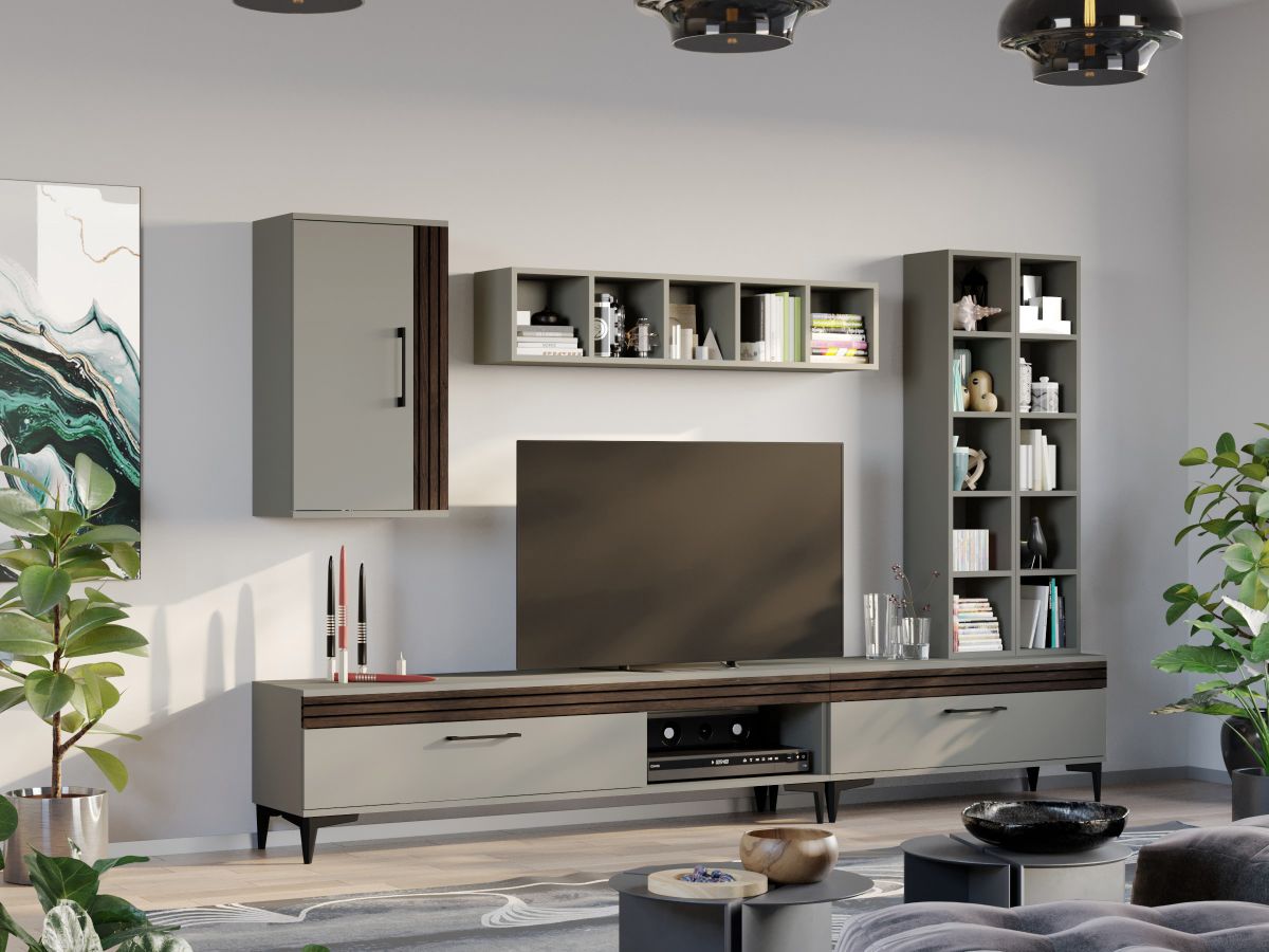 Living Nori C02 – Mobila sufragerie Living Nori C02 – Mobila sufragerie face parte din familia de mobila pentru sufragerie / living Nori . Aceasta colectie este alcatuita din mai multe module, care, prin combinatiile de materiale si culori, denota o eleganta si un rafinament aparte. Puteti alege direct din configuratiile realizate de noi sau, daca doriti, puteti creea singuri propria configuratie de living combinand corpurile de mobila astfel incat sa se potriveasca perfect in spatiul dorit. Livrare gratuita si rapida, 4-10 zile lucratoare prin flota proprie Suntem producatori de mobilier, fara intermediari Toate piesele de mobilier au o garantie de 2 ani Living Nori C02 – Mobila sufragerie Corpurile din gama Living Nori sunt construite din PAL melaminat de 16mm cu finisaj Casmir si Deep Line (cu aspect care imita riflajul) care, impreuna cu manerele si picioarele negre , creeaza un ambient primitor si o atmosfera placuta. Cantul aplicat este unul de 0,6 care le permite muchiilor sa fie placute la atingere. Atentie! Elementele de prindere de tipul dibluri, surub sau horsurub nu sunt incluse deoarce tipul de prindere difera in functie de tipul peretelui pe care urmeaza a se monta mobilierul (beton, caramida, BCA, rigips, lemn etc). Video de prezentare familie Videoclipul de prezentare poate contine mai putine sau mai multe corpuri de mobilier in comparatie cu produsul de pe aceasta pagina. Scopul acestui video este de a detalia aspectul materialelor, accesoriilor cat si a familiei din care face parte. Dimensiuni Living Nori C02 Imaginea alaturata prezinta compartimentarea pentru Living Nori C02 – Mobila sufragerie . Aceasta configuratie are 6 corpuri modulare , 4 suspendate si 2 pe sol. Spatii de depozitare cu usa cat si etajere si polite. Dimensiuni corpuri componente: Comoda TV 1000: L 100 x A 33.5 x H 43.7 cm – Schita Montaj Comoda TV 1600: L 160 x A 33.5 x H 43.7 cm – Schita Montaj Corp Superior: L 43.9 x A 26.6 x H 77 cm – Schita Montaj 3 x Corp Decorativ cu Polite: L 120 x A 22 x H 25 cm – Schita Montaj Inaltime picioare 12cm, este inclusa in dimensiunile corpurilor si dimensiunea totala. Dimensiuni totale livin L 260 x A 33.5 x H 170 cm (inaltimea poate varia in functie de inaltimea pentru care optati atunci cand suspendati corpurile superioare) Spatiul de TV: diagonala recomandata maxima 180cm/70″ Toate corpurile se pot pune pe stanga sau pe dreapta in functie de cum doriti. Nu este obligatoriu pozitionarea ca in prezentare. Ele nu sunt prinse unul de celalalt. Pretul afisat nu include alte accesorii sau obiecte de decor (TV, tablouri, elemente de iluminat, covor etc.) Dimensiunile sunt exprimate in cm si pot oscila intre ± 10 mm. Living Nori C02 – Mobila sufragerie se livreaza demontat si este insotit de accesorii si instructiuni de asamblare.