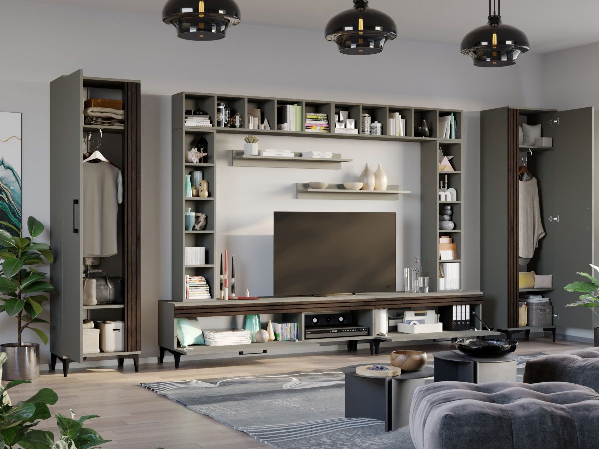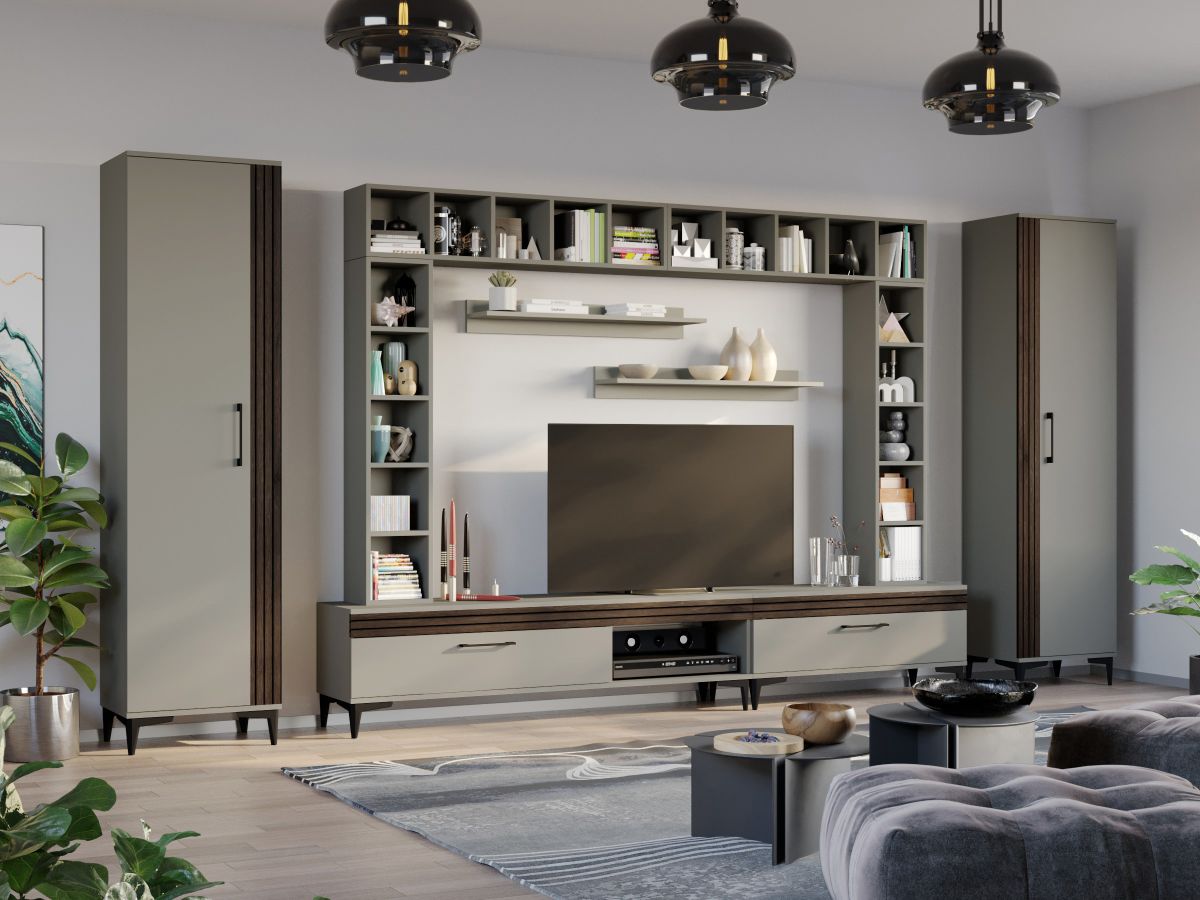 Living Nori C06 – Mobila sufragerie Living Nori C06 – Mobila sufragerie face parte din familia de mobila pentru sufragerie / living Nori . Aceasta colectie este alcatuita din mai multe module, care, prin combinatiile de materiale si culori, denota o eleganta si un rafinament aparte. Puteti alege direct din configuratiile realizate de noi sau, daca doriti, puteti creea singuri propria configuratie de living combinand corpurile de mobila astfel incat sa se potriveasca perfect in spatiul dorit. Livrare gratuita si rapida, 4-10 zile lucratoare prin flota proprie Suntem producatori de mobilier, fara intermediari Toate piesele de mobilier au o garantie de 2 ani Living Nori C06 – Mobila sufragerie Corpurile din gama Living Nori sunt construite din PAL melaminat de 16mm cu finisaj Casmir si Deep Line (cu aspect care imita riflajul) care, impreuna cu manerele si picioarele negre , creeaza un ambient primitor si o atmosfera placuta. Cantul aplicat este unul de 0,6 care le permite muchiilor sa fie placute la atingere. Atentie! Elementele de prindere de tipul dibluri, surub sau horsurub nu sunt incluse deoarce tipul de prindere difera in functie de tipul peretelui pe care urmeaza a se monta mobilierul (beton, caramida, BCA, rigips, lemn etc). Video de prezentare familie Videoclipul de prezentare poate contine mai putine sau mai multe corpuri de mobilier in comparatie cu produsul de pe aceasta pagina. Scopul acestui video este de a detalia aspectul materialelor, accesoriilor cat si a familiei din care face parte. Dimensiuni Living Nori C06 Imaginea alaturata prezinta compartimentarea pentru Living Nori C06 – Mobila sufragerie . Aceasta configuratie are 10 corpuri modulare , 6 suspendate si 4 pe sol. Spatii de depozitare cu usa cat si etajere si polite. Dulapurile au bare de haine. Dimensiuni corpuri componente: 2 x Dulap Haine: L 51.6 x A 35.1 x H 192.4 cm – Schita Montaj Comoda TV 1000: L 100 x A 33.5 x H 43.7 cm – Schita Montaj Comoda TV 1600: L 160 x A 33.5 x H 43.7 cm – Schita Montaj 4 x Corp Decorativ cu Polite: L 120 x A 22 x H 25 cm – Schita Montaj Set 2 Polite Suspendate: L 91.8 x A 18.6 x H 12 cm – Schita Montaj Inaltime picioare 12cm, este inclusa in dimensiunile corpurilor si dimensiunea totala. Dimensiuni totale livin L 400 x A 35.1 x H 192.4 cm (inaltimea poate varia in functie de inaltimea pentru care optati atunci cand suspendati corpurile superioare) Spatiul de TV: diagonala recomandata maxima 180cm/70″ Toate corpurile se pot pune pe stanga sau pe dreapta in functie de cum doriti. Nu este obligatoriu pozitionarea ca in prezentare. Ele nu sunt prinse unul de celalalt. Pretul afisat nu include alte accesorii sau obiecte de decor (TV, tablouri, elemente de iluminat, covor etc.) Dimensiunile sunt exprimate in cm si pot oscila intre ± 10 mm. Living Nori C06 – Mobila sufragerie se livreaza demontat si este insotit de accesorii si instructiuni de asamblare.