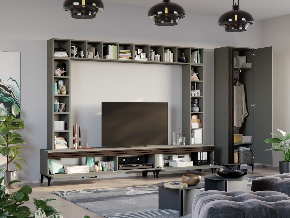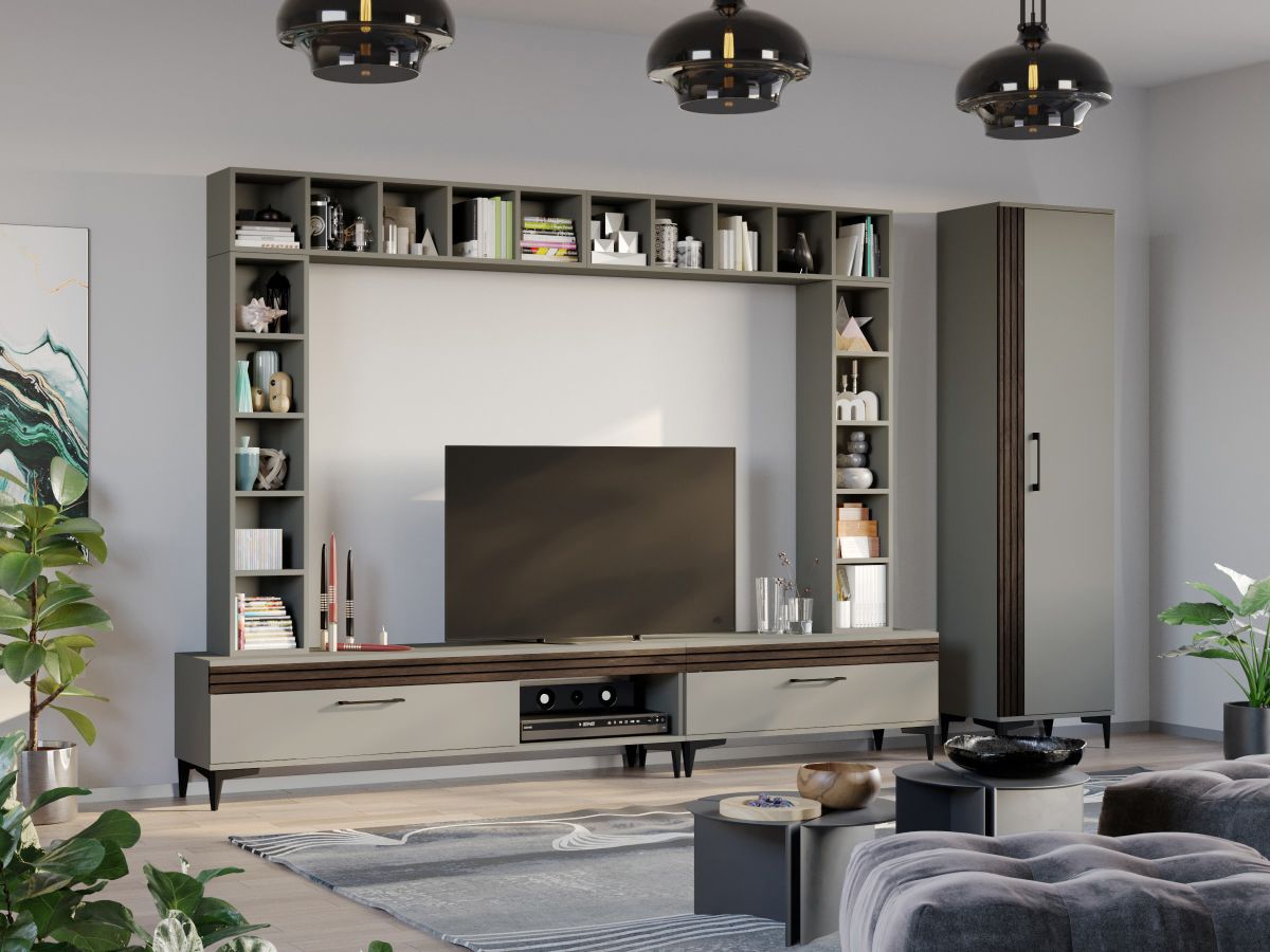 Living Nori C07 – Mobila sufragerie Living Nori C07 – Mobila sufragerie face parte din familia de mobila pentru sufragerie / living  Nori . Aceasta colectie este alcatuita din mai multe module, care, prin combinatiile de materiale si culori, denota o eleganta si un rafinament aparte. Puteti alege direct din configuratiile realizate de noi sau, daca doriti, puteti creea singuri propria configuratie de living combinand corpurile de mobila astfel incat sa se potriveasca perfect in spatiul dorit. Livrare gratuita si rapida, 4-10 zile lucratoare prin flota proprie Suntem producatori de mobilier, fara intermediari Toate piesele de mobilier au o garantie de 2 ani Living Nori C07 – Mobila sufragerie Corpurile din gama  Living Nori  sunt construite din  PAL melaminat de 16mm  cu finisaj  Casmir si Deep Line  (cu aspect care imita riflajul) care, impreuna cu  manerele si picioarele negre , creeaza un ambient primitor si o atmosfera placuta. Cantul aplicat este unul de 0,6 care le permite muchiilor sa fie placute la atingere. Atentie! Elementele de prindere de tipul dibluri, surub sau horsurub nu sunt incluse deoarce tipul de prindere difera in functie de tipul peretelui pe care urmeaza a se monta mobilierul (beton, caramida, BCA, rigips, lemn etc). Video de prezentare familie Videoclipul de prezentare poate contine mai putine sau mai multe corpuri de mobilier in comparatie cu produsul de pe aceasta pagina. Scopul acestui video este de a detalia aspectul materialelor, accesoriilor cat si a familiei din care face parte. Dimensiuni Living Nori C07 Imaginea alaturata prezinta compartimentarea pentru Living Nori C07 – Mobila sufragerie . Aceasta configuratie are 7 corpuri modulare , 4 suspendate si 3 pe sol. Spatii de depozitare cu usa cat si etajere si polite. Dulapul are o bara de haine. Dimensiuni corpuri componente: Dulap Haine: L 51.6 x A 35.1 x H 192.4 cm – Schita Montaj Comoda TV 1000: L 100 x A 33.5 x H 43.7 cm – Schita Montaj Comoda TV 1600: L 160 x A 33.5 x H 43.7 cm – Schita Montaj 4 x Corp Decorativ cu Polite: L 120 x A 22 x H 25 cm – Schita Montaj Inaltime picioare 12cm, este inclusa in dimensiunile corpurilor si dimensiunea totala. Dimensiuni totale livin L 320 x A 35.1 x H 192.4 cm (inaltimea poate varia in functie de inaltimea pentru care optati atunci cand suspendati corpurile superioare) Spatiul de TV: diagonala recomandata maxima 180cm/70″ Toate corpurile se pot pune pe stanga sau pe dreapta in functie de cum doriti. Nu este obligatoriu pozitionarea ca in prezentare. Ele nu sunt prinse unul de celalalt. Pretul afisat nu include alte accesorii sau obiecte de decor (TV, tablouri, elemente de iluminat, covor etc.) Dimensiunile sunt exprimate in cm si pot oscila intre ± 10 mm. Living Nori C07 – Mobila sufragerie se livreaza demontat si este insotit de accesorii si instructiuni de asamblare.