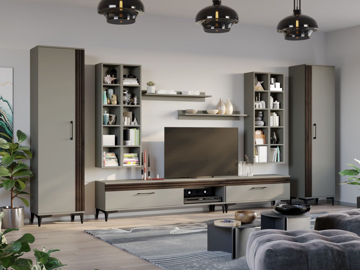 Living Nori C11 – Mobila sufragerie Living Nori C11 – Mobila sufragerie face parte din familia de mobila pentru sufragerie / living Nori . Aceasta colectie este alcatuita din mai multe module, care, prin combinatiile de materiale si culori, denota o eleganta si un rafinament aparte. Puteti alege direct din configuratiile realizate de noi sau, daca doriti, puteti creea singuri propria configuratie de living combinand corpurile de mobila astfel incat sa se potriveasca perfect in spatiul dorit. Livrare gratuita si rapida, 4-10 zile lucratoare prin flota proprie Suntem producatori de mobilier, fara intermediari Toate piesele de mobilier au o garantie de 2 ani Living Nori C11 – Mobila sufragerie Corpurile din gama Living Nori sunt construite din PAL melaminat de 16mm cu finisaj Casmir si Deep Line (cu aspect care imita riflajul) care, impreuna cu manerele si picioarele negre , creeaza un ambient primitor si o atmosfera placuta. Cantul aplicat este unul de 0,6 care le permite muchiilor sa fie placute la atingere. Atentie! Elementele de prindere de tipul dibluri, surub sau horsurub nu sunt incluse deoarce tipul de prindere difera in functie de tipul peretelui pe care urmeaza a se monta mobilierul (beton, caramida, BCA, rigips, lemn etc). Video de prezentare familie Videoclipul de prezentare poate contine mai putine sau mai multe corpuri de mobilier in comparatie cu produsul de pe aceasta pagina. Scopul acestui video este de a detalia aspectul materialelor, accesoriilor cat si a familiei din care face parte. Dimensiuni Living Nori C11 Imaginea alaturata prezinta compartimentarea pentru Living Nori C11 – Mobila sufragerie . Aceasta configuratie are 10 corpuri modulare , 6 suspendate si 4 pe sol. Spatii de depozitare cu usa cat si etajere si polite. Dulapurile au bare de haine. Dimensiuni corpuri componente: 2 x Dulap Haine: L 51.6 x A 35.1 x H 192.4 cm – Schita Montaj Comoda TV 1000: L 100 x A 33.5 x H 43.7 cm – Schita Montaj Comoda TV 1600: L 160 x A 33.5 x H 43.7 cm – Schita Montaj 4 x Corp Decorativ cu Polite: L 120 x A 22 x H 25 cm – Schita Montaj Set 2 Polite Suspendate: L 91.8 x A 18.6 x H 12 cm – Schita Montaj Inaltime picioare 12cm, este inclusa in dimensiunile corpurilor si dimensiunea totala. Dimensiuni totale livin L 390 x A 35.1 x H 192.4 cm (inaltimea poate varia in functie de inaltimea pentru care optati atunci cand suspendati corpurile superioare) Spatiul de TV: diagonala recomandata maxima 180cm/70″ Toate corpurile se pot pune pe stanga sau pe dreapta in functie de cum doriti. Nu este obligatoriu pozitionarea ca in prezentare. Ele nu sunt prinse unul de celalalt. Pretul afisat nu include alte accesorii sau obiecte de decor (TV, tablouri, elemente de iluminat, covor etc.) Dimensiunile sunt exprimate in cm si pot oscila intre ± 10 mm. Living Nori C11 – Mobila sufragerie se livreaza demontat si este insotit de accesorii si instructiuni de asamblare.